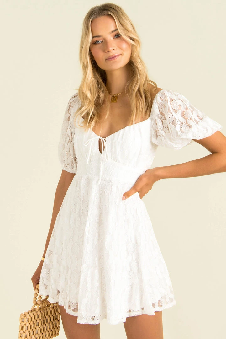 Short and sweet! Our lovely Leanne Dress is made from a high-quality lace fabric in white. she features a a cupped bust with tie-up detail, puff sleeves, a fitted waist and full skirt. We love her styled with boots and a mini bag for an adorable weekend look!
