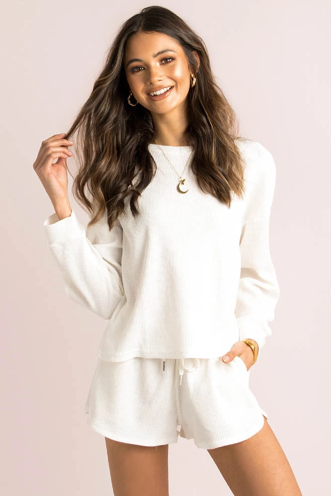 A cute basic your wardrobe will love! This cute top is made from a waffle textured fabric in white and is an easy fit with long sleeves and a crew neckline. We love it styled with out matching Pippa Shorts, a mini bag and sneakers for the perfect off-duty look!