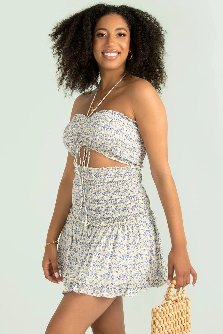 Ready for the sunshine in our gorgeous Lonni Skirt! This lovely mini skirt is made from a white and blue floral print fabric and features a shirred elastic waist with a flirty ruffle skirt. Style her with a matching Lonni Top for total Summer vibes! Top and skirt sold separately.