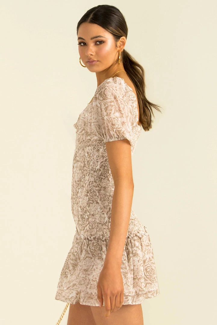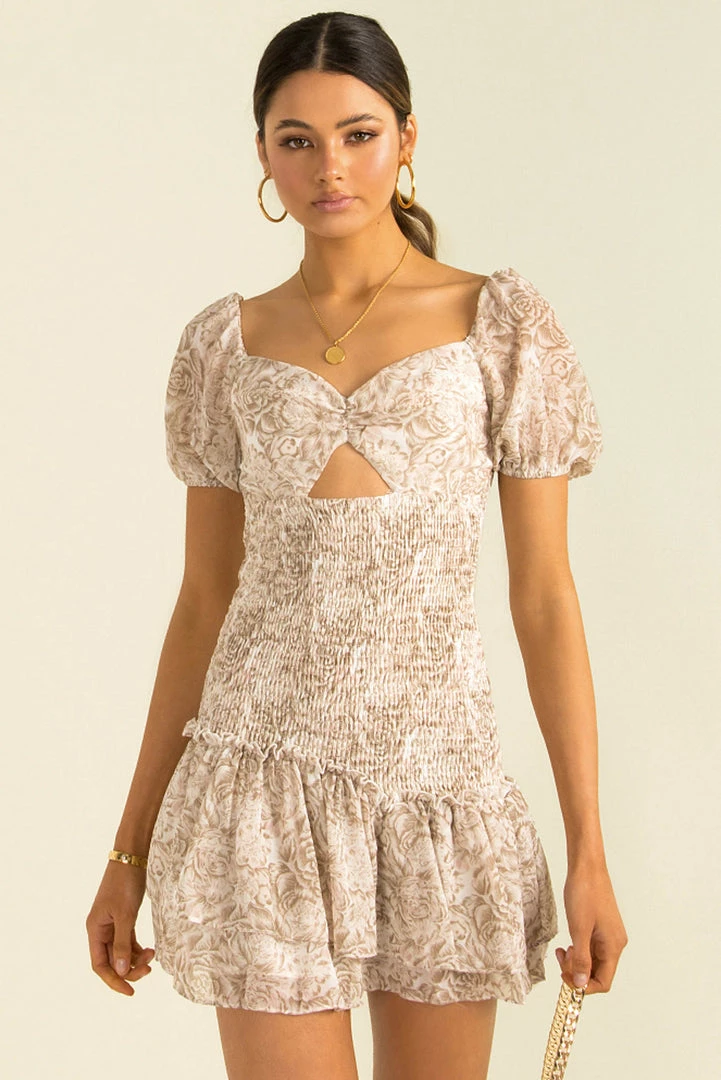 An adorable mini dress is a dreamy print fabric! Our lovely Louisa Dress is made from a chiffon fabric in a white and beige rose print. She has the most beautiful details; short puff sleeves, a cutout under the bust, shirred elastic body and tiered ruffle skirt. Style her with gold hoops, beige strappy heels and a mini bag for the perfect party look!