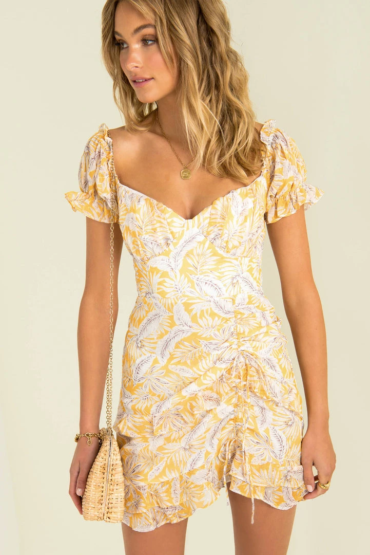 The perfect party dress! Made from a dreamy printed fabric, this beautiful dress features puff sleeves, a padded bust and lovely drawstring and ruffle details through the skirt. Style her with nude heels and a mini bag for your next night out!