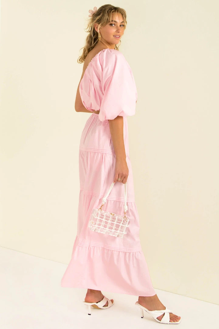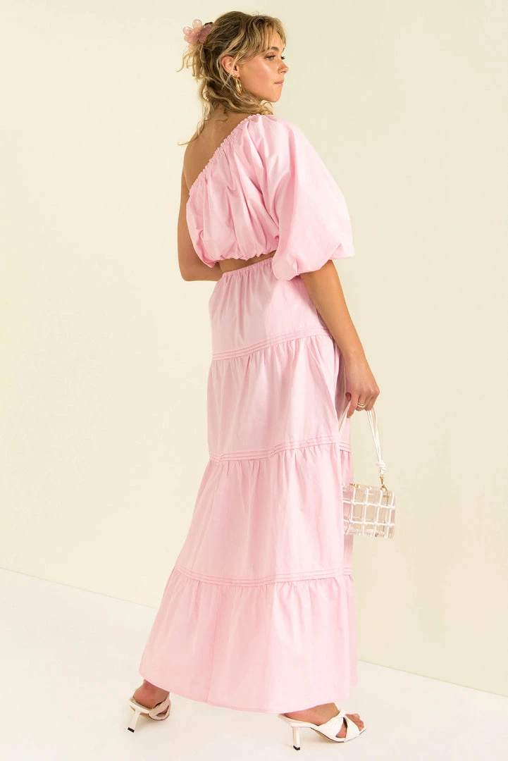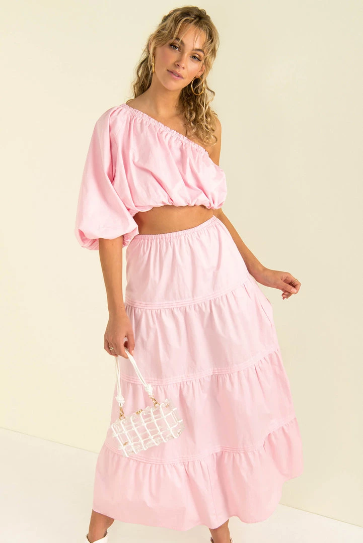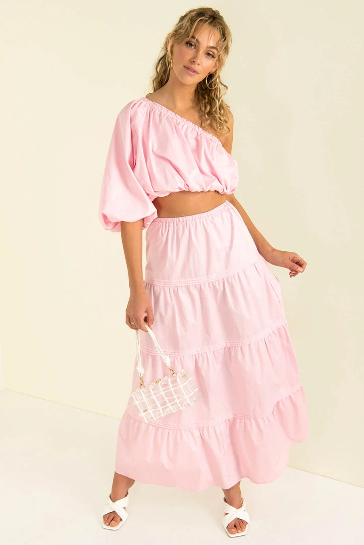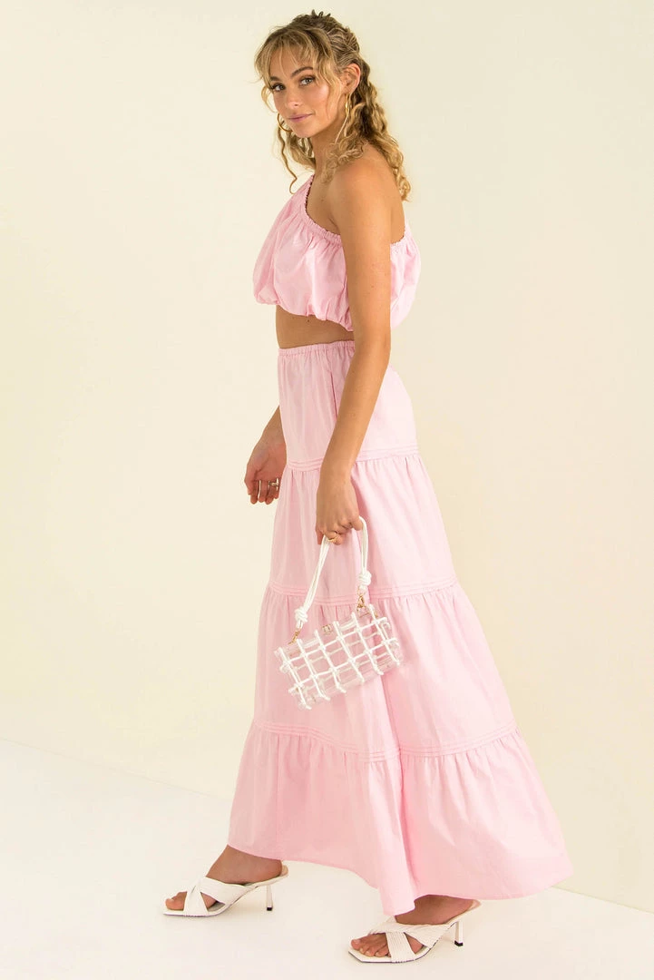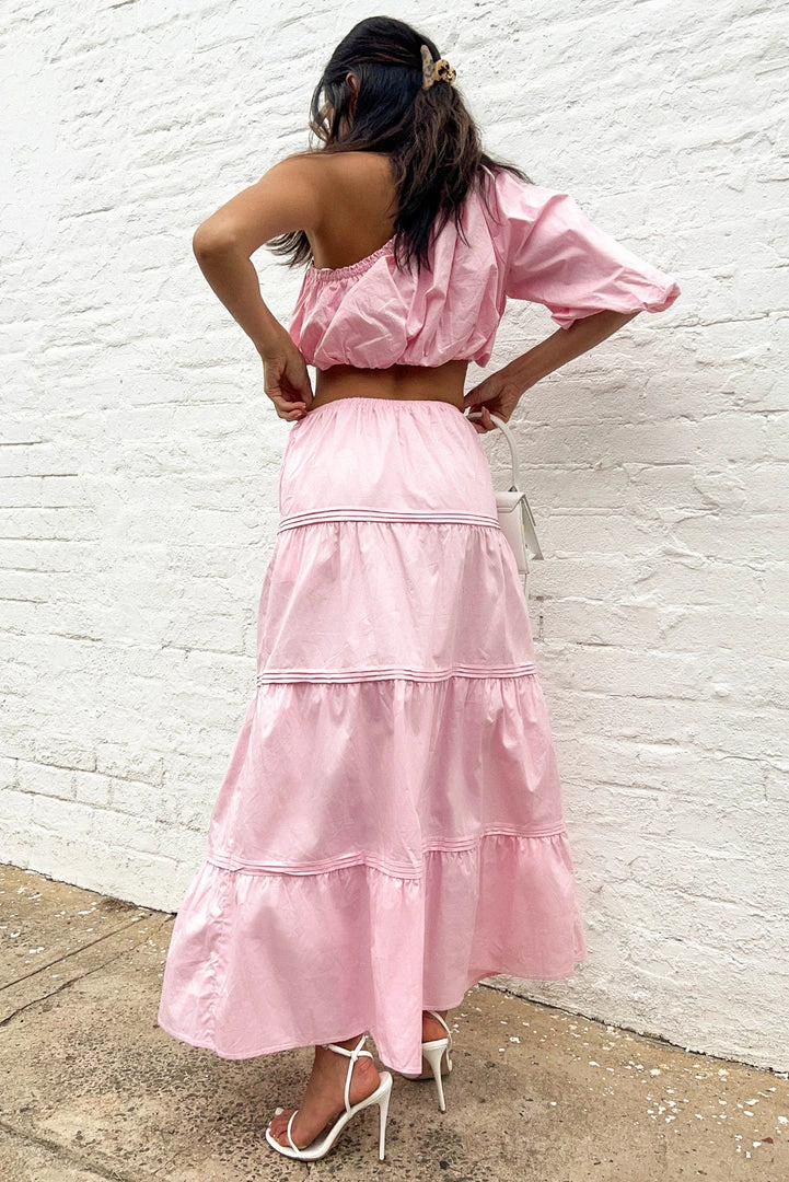Our Matilda Maxi Skirt is a high-waisted style in a pink cotton fabric. She features an elasticated waist and panel detailing. Style her with our matching Nixie Top and mules for an easy breezy weekend look.