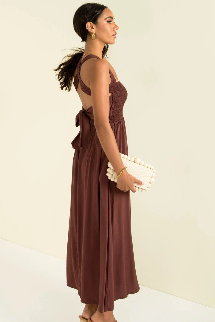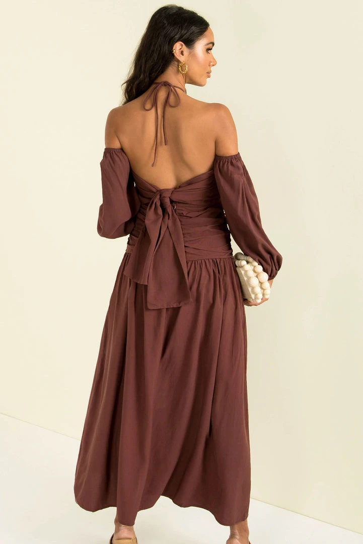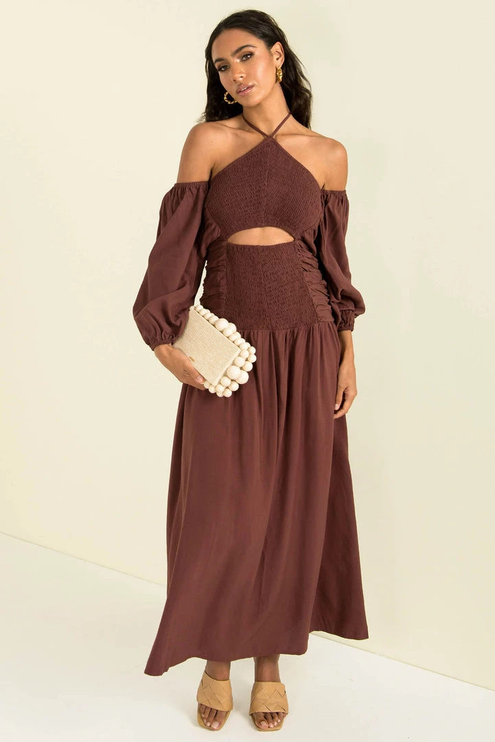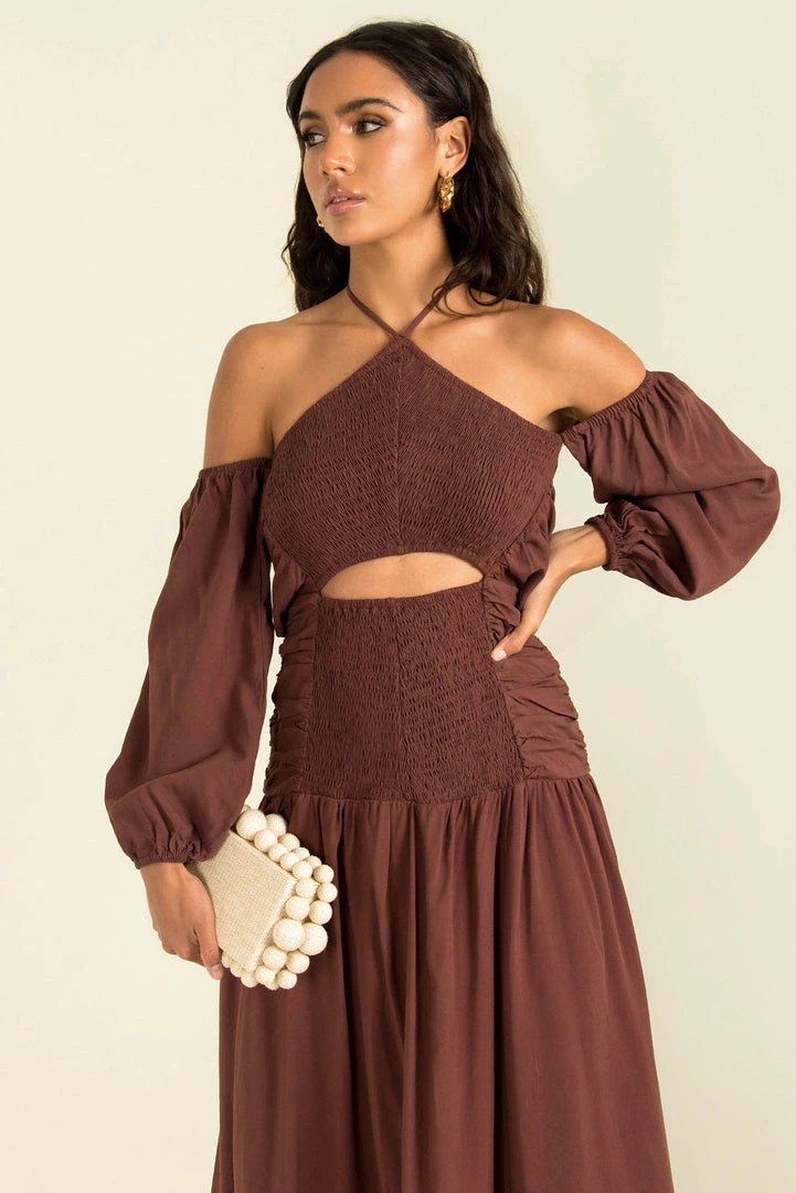 Make an entrance in our stunning Maya Dress! This beautiful maxi dress is made from a high-quality cotton fabric in a gorgeous chocolate hue! She has a halter neckline, shirred detailing, long sleeves and a cutout detail at the waist. She her with gold hoops, a clutch and strappy heels for your next event.