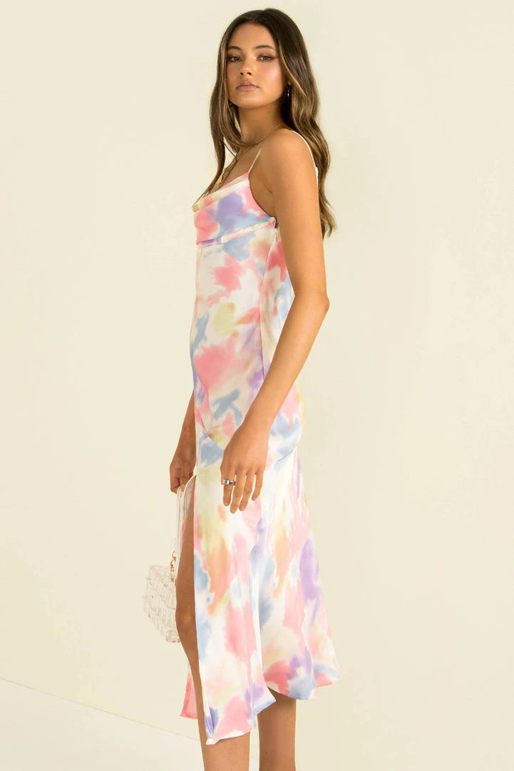 Feel like an absolute goddess in our Mika Dress! This beautiful midi dress is made from a dreamy print fabric in shades of pink, blue and yellow. She features draping across the bust, thin adjustable straps and a min-length skirt. Style her with gold jewellery, a clutch and nude heels for your next event!