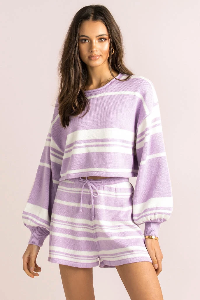 Cute and comfy in our gorgeous Mimi Shorts! These lilac and white stripe shorts are made from a  knit fabric and feature a high-waist with an adjustable tie. We love them styled with out matching Mimi Top, a woven back and cute slides for the perfect off-duty look!