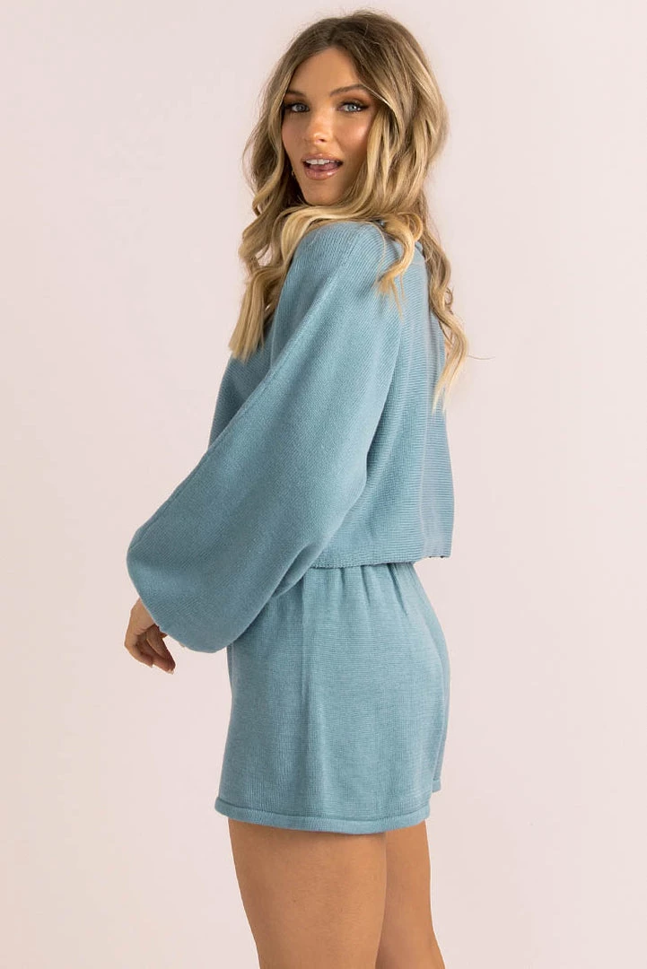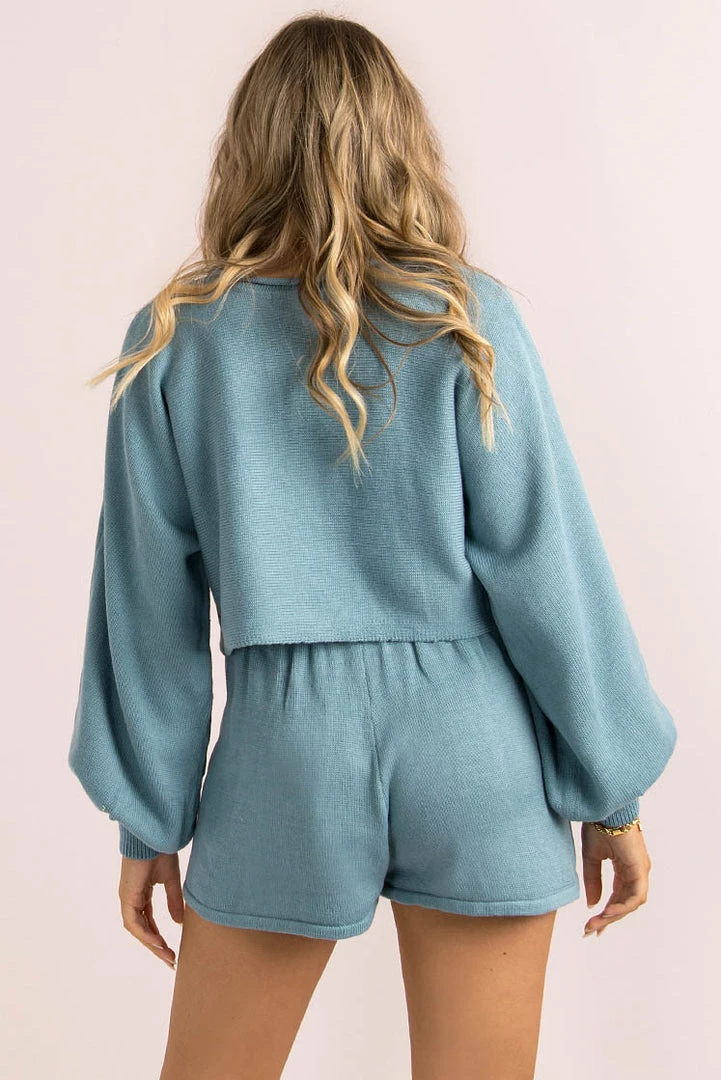Cute and comfy in our gorgeous Mimi Top! This Teal knit top is an easy fit with long sleeves and a crew neckline. We love it styled with out matching Mimi Shorts, a woven bag and cute slides for the perfect off-duty look!