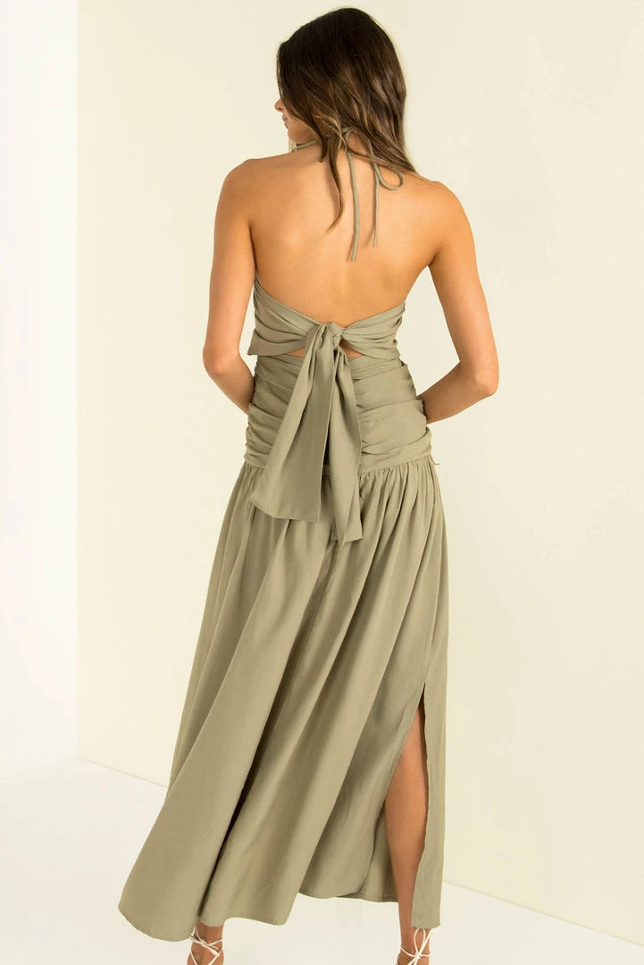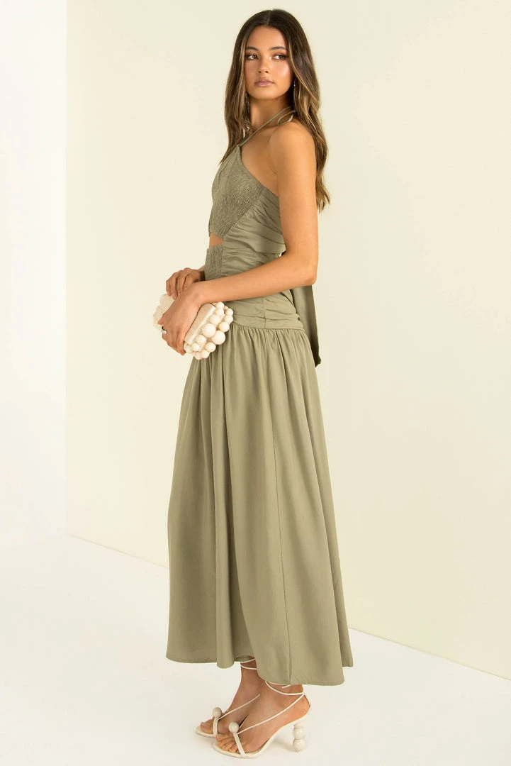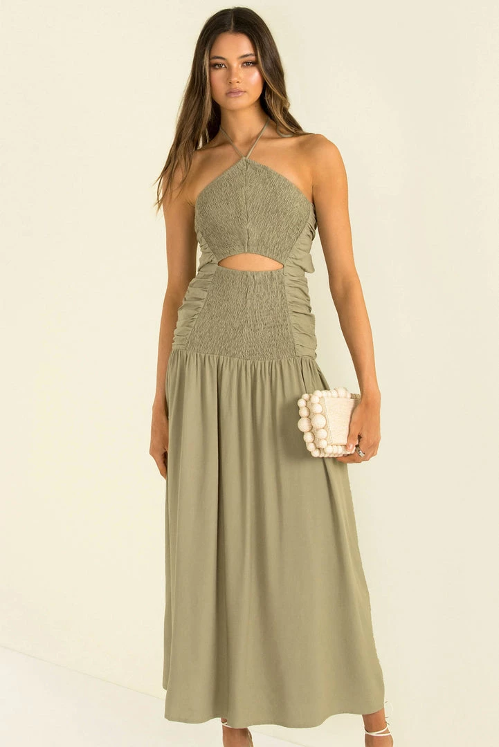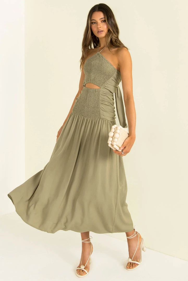 Make an entrance in our stunning Mirage Dress! This beautiful maxi dress is made from a high-quality cotton fabric in a gorgeous khaki hue! She has a halter neckline, shirred detailing and a cutout detail at the waist. She her with gold hoops, a clutch and strappy heels for your next event.