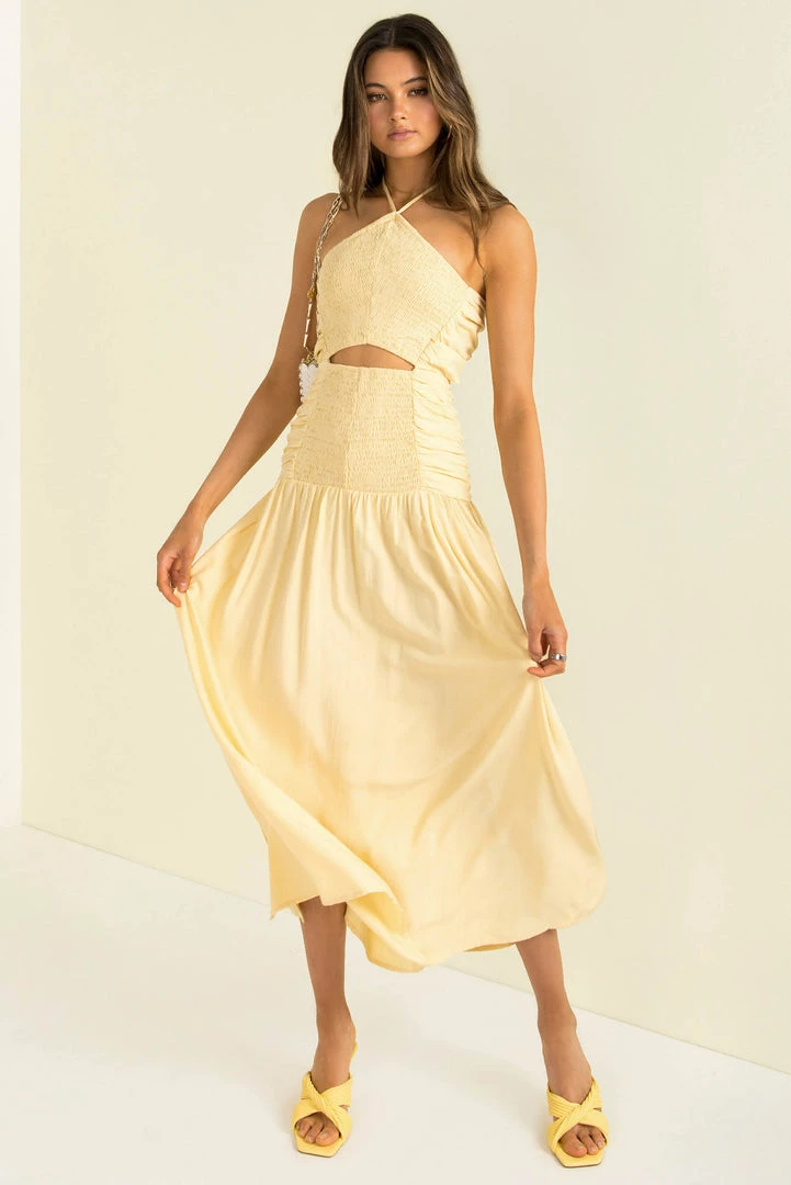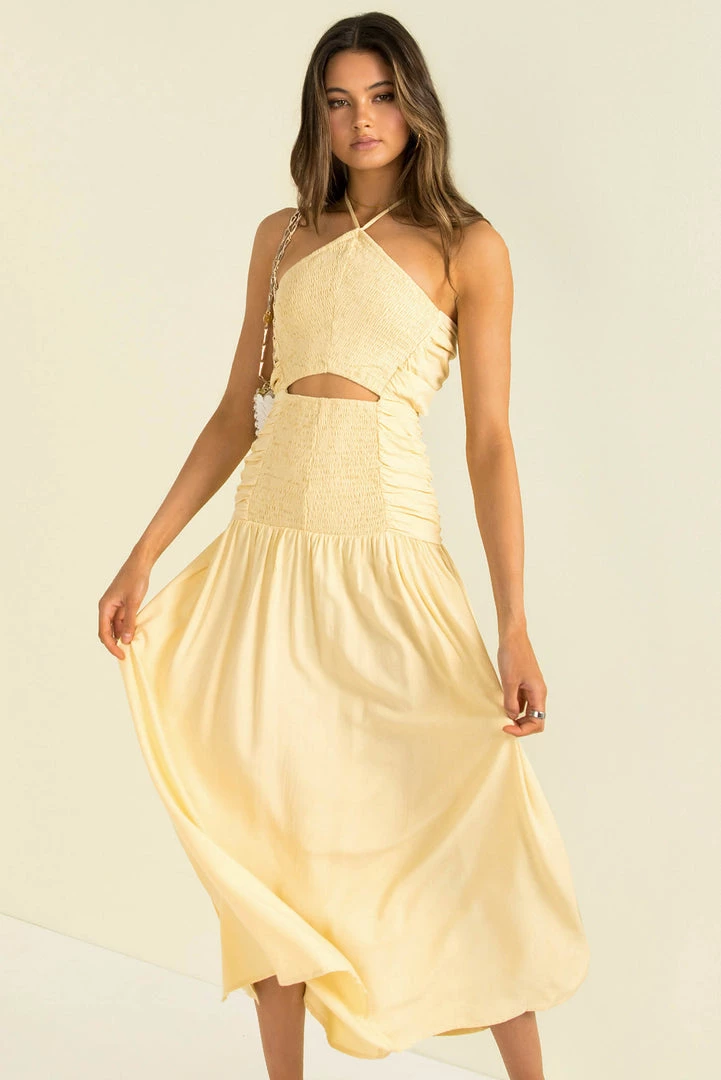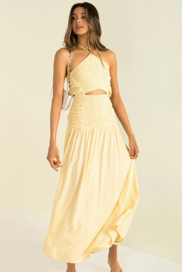 Make an entrance in our stunning Mirage Dress! This beautiful maxi dress is made from a high-quality cotton fabric in a soft yellow hue! She has a halter neckline, shirred detailing and a cutout detail at the waist. She her with gold hoops, a clutch and strappy heels for your next event.