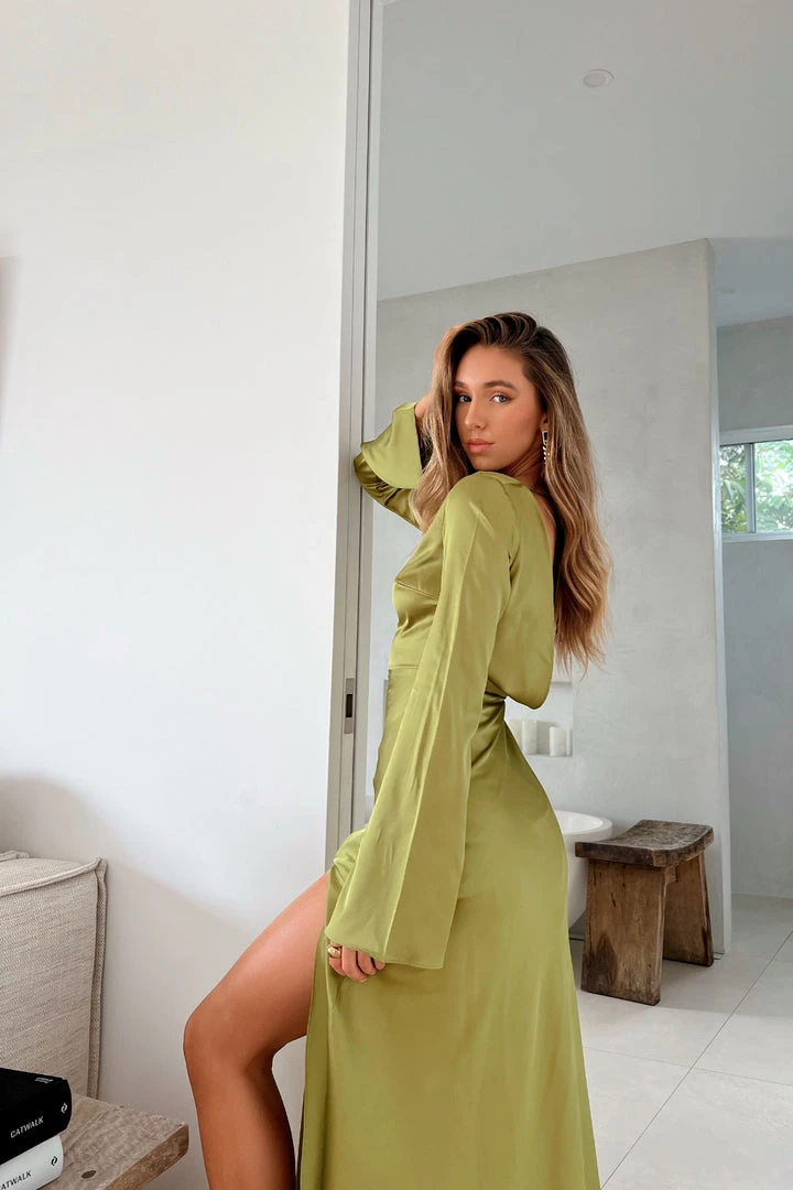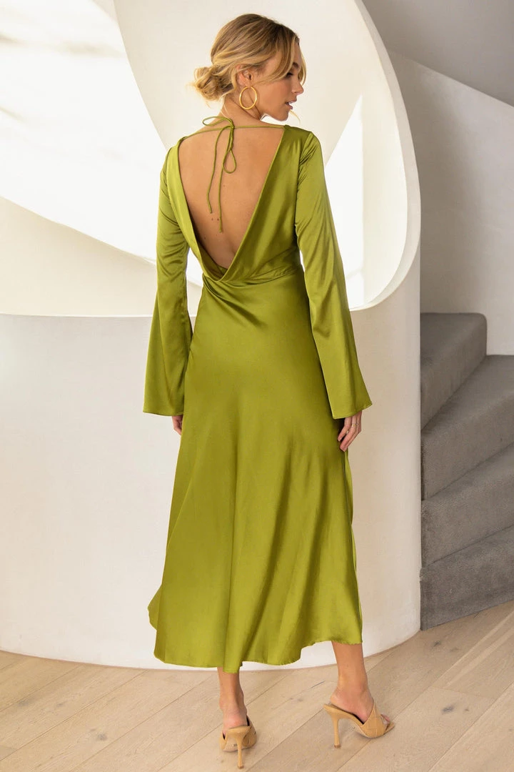 Turn heads in our stunning Monika Dress! This chic midi dress is made from an high-quality, satin fabric in a beautiful olive green. She features a a high neckline, long sleeves and a mid-length skirt with front leg split. She also has the most beautiful open back feature; draping low with a tie-up detail . Style her with nude heels and gold hoops for your next event.