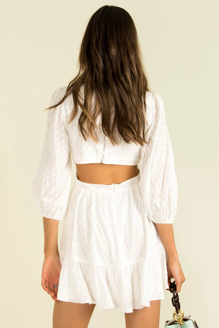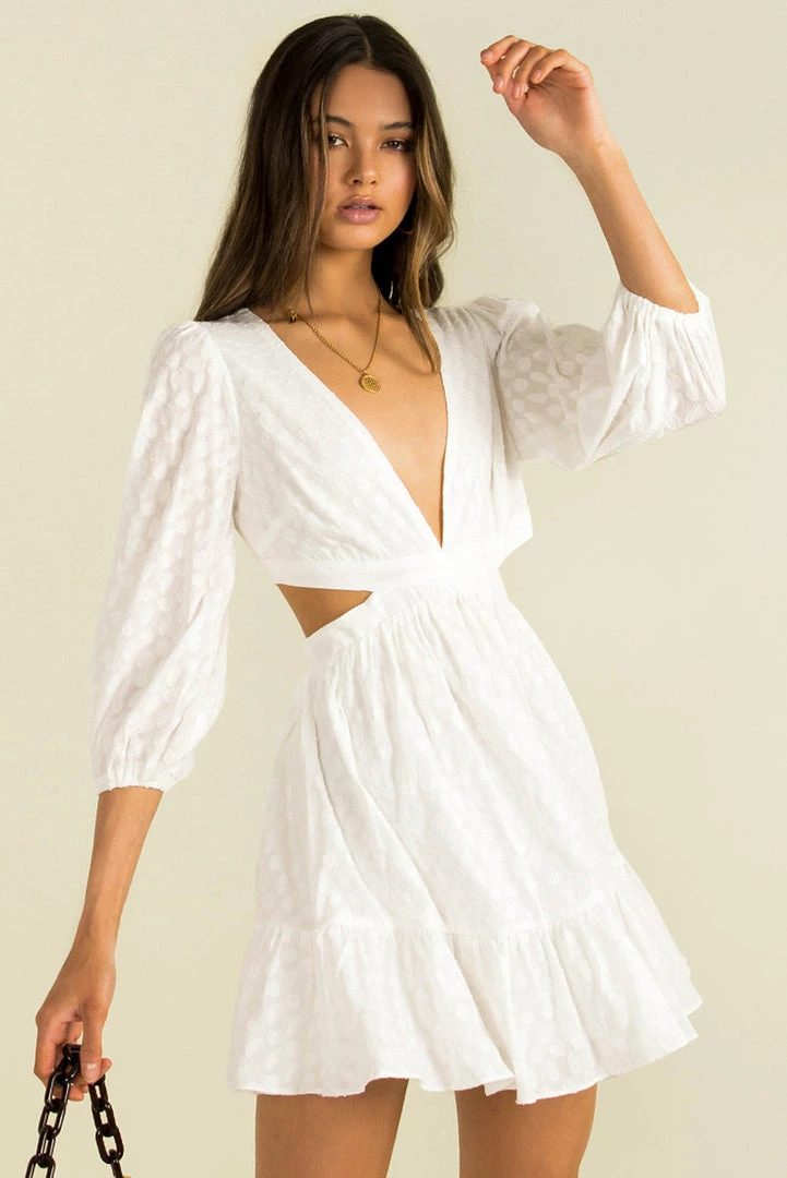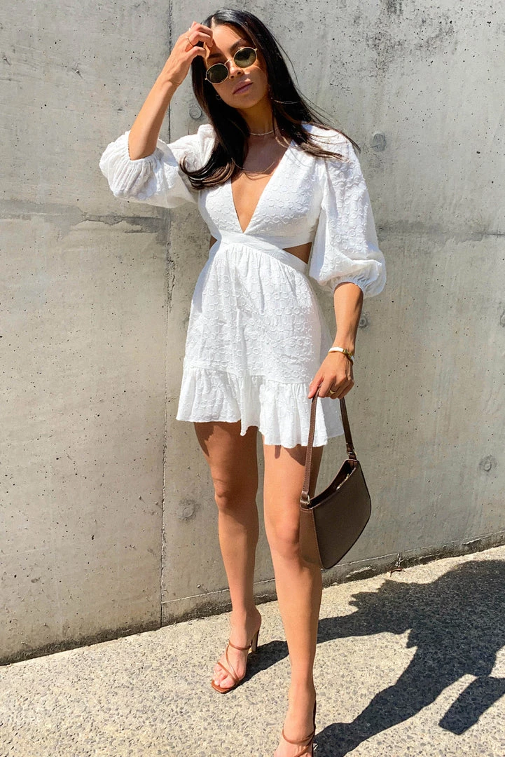 Weekend ready in our stunning Monty Dress! This gorgeous white mini is made from a high-quality cotton fabric with a spot texture throughout. She features a v-neckline, long sleeves, cutouts at the waist and an a-line skirt. Style her with gold hoops and strappy heels for the perfect party look.