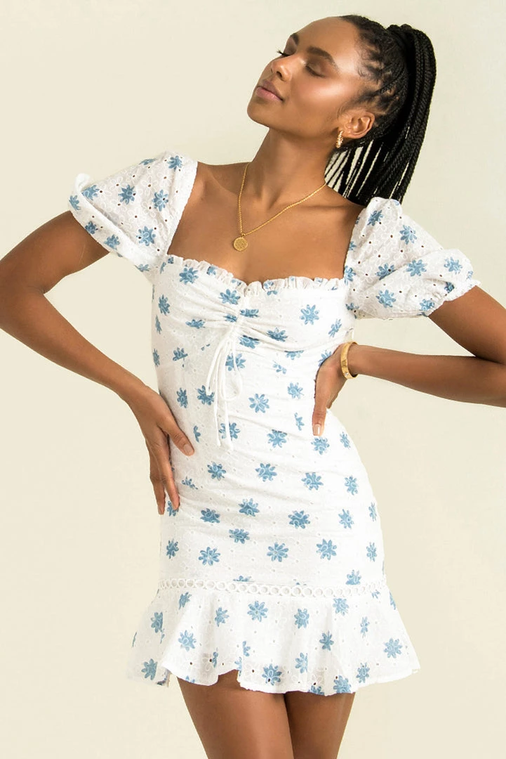 Sweet and pretty! Our gorgeous Neve Dress is made from a white anglaise fabric with a blue floral design throughout. This adorable mini features a drawstring detail at the bust, puff sleeves and gorgeous frill details. Style her her with strappy heels or keep her casual with a pair of cowboy boots!