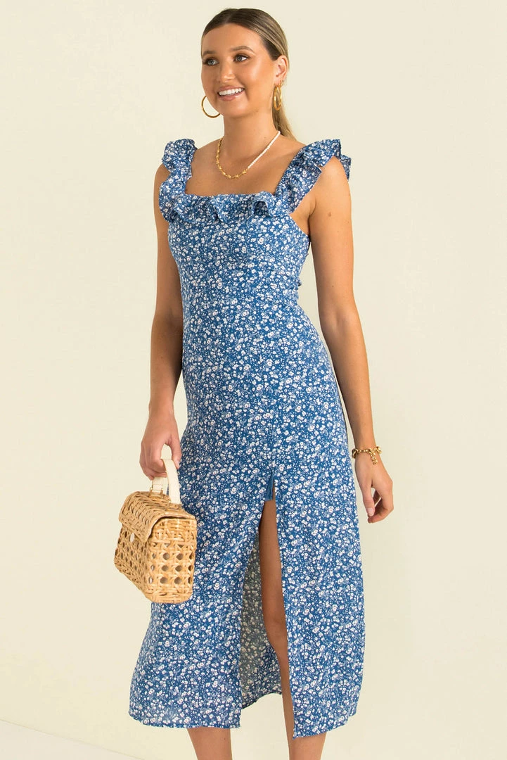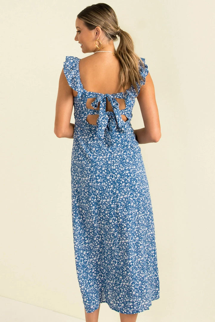 Ready for the weekend in our lovely Abi Dress! This adorable midi dress is made from navy blue floral fabric and features a square neckline, ruffle shoulder straps and a mid-length skirt with front split. She also has a gorgeous open back with tie-up details. Style her with mules and a mini bag for a gorgeous weekend look!