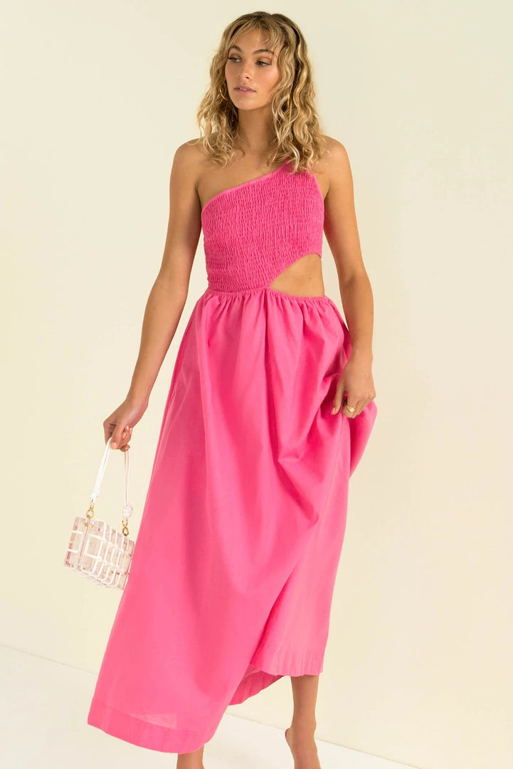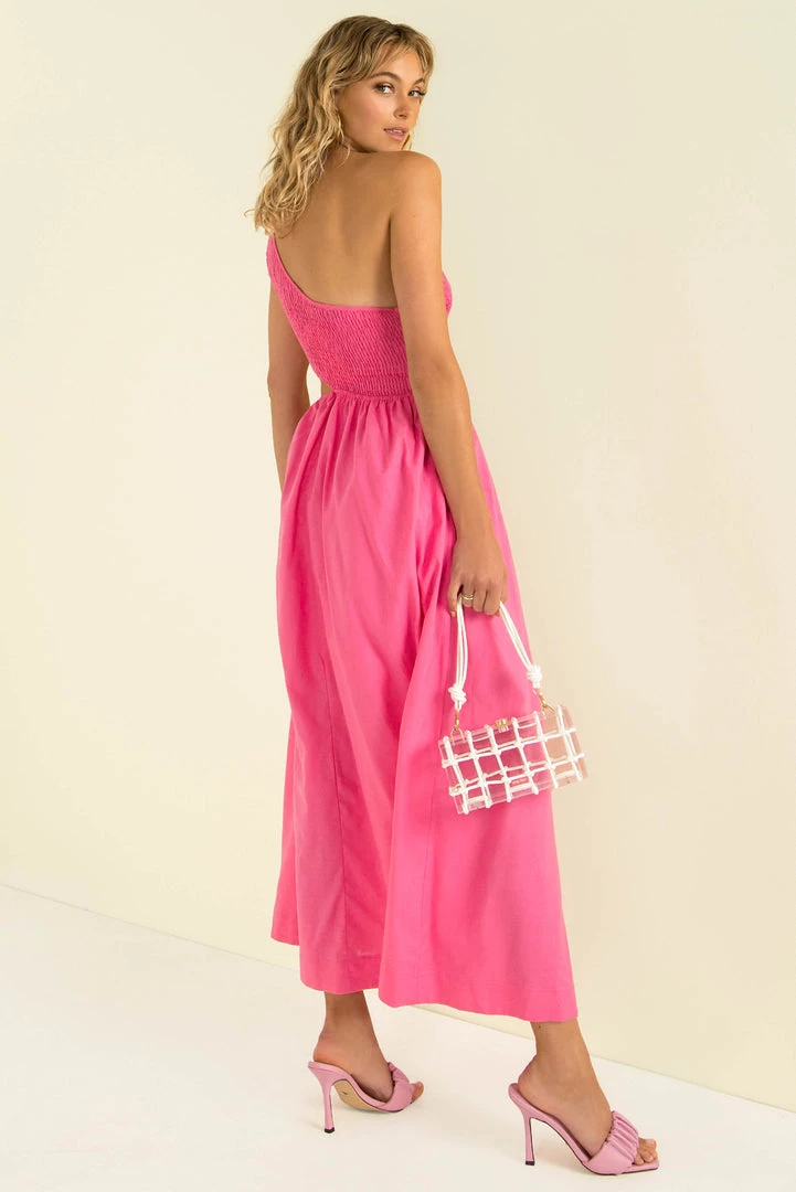 The perfect pop of colour! Our beautiful Asher Dress is made from a high-quality, linen fabric in a beautiful fuchsia colour. She features a shirred bodice with one shoulder strap, cutout at the waist and a mid-length skirt. Finish your look with gold hoops, tan heels and a clutch.