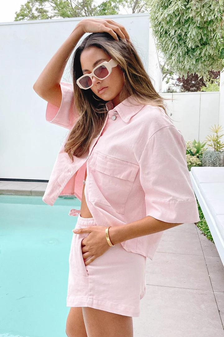 Comfy and cute. Our gorgeous Astrid Shorts are made from a high-quality denim fabric in baby pink! They have an elastic waist with drawstring tie, two side pockets and the best fit! We love them styled with our matching Astrid Shirt and chunky sandals!