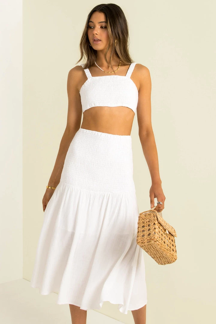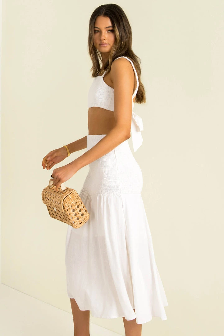 The most beautiful midi skirt! Our lovely Cara Skirt is made from a high-quality white fabric. She features a high-waist with shirred elastic detailing that turns into a flowing skirt. We love her styled with gold hoops, our matching Cara Top and mules for the perfect weekend look!