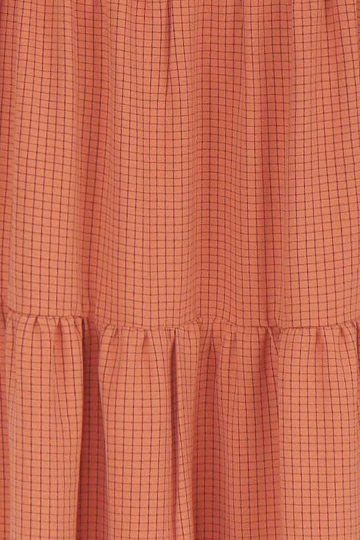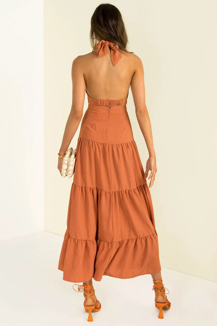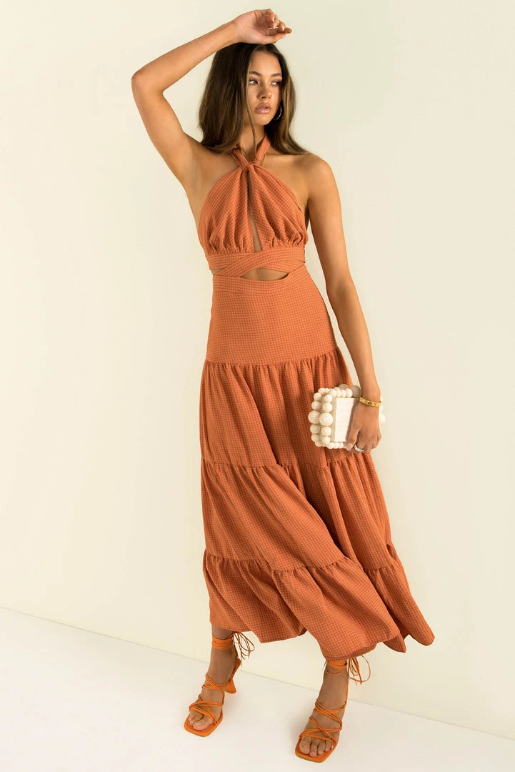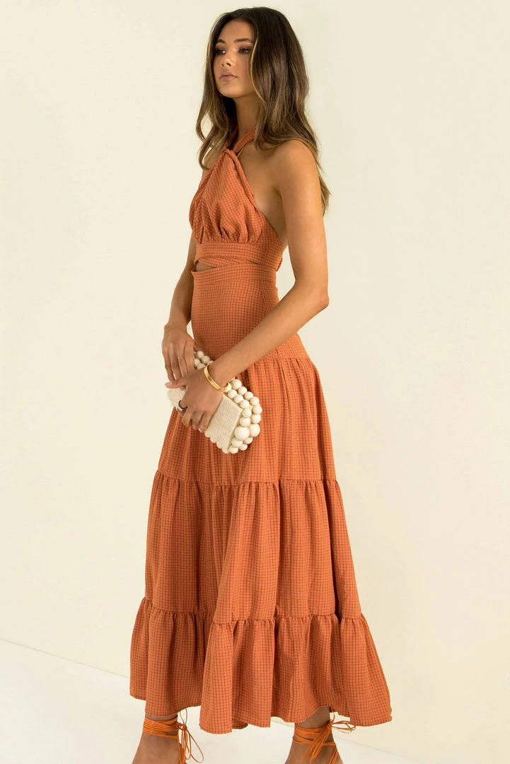 Our stunning Gia Dress is perfect for your next event! This beautiful midi dress is made from a high-quality fabric in a rust with a grid pattern throughout. She features a halter neckline with crossover and cutout detailing through the bodice, and a long flowing skirt. Finish your look with tan mules and a clutch.