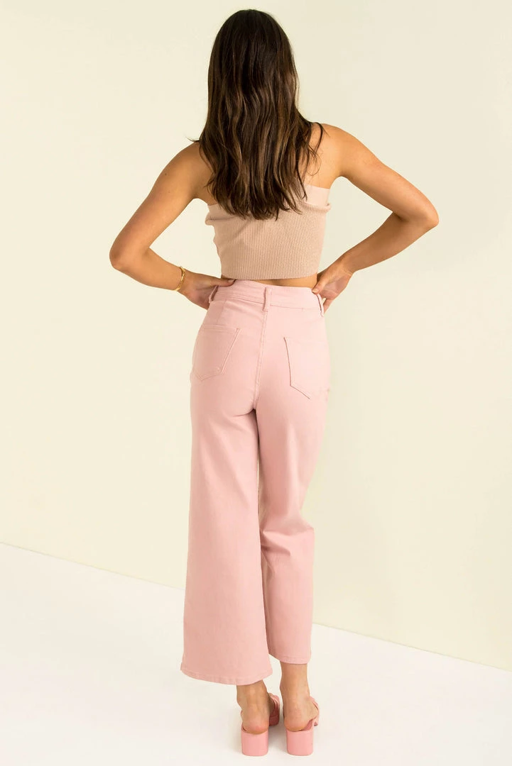Our Harrison Jeans are a classic wide leg pant made form a stretch denim in a baby pink. They’re a high-waisted style with a slightly cropped leg for a flattering fit. We love them styled with a fitted tank and chunky sandals.