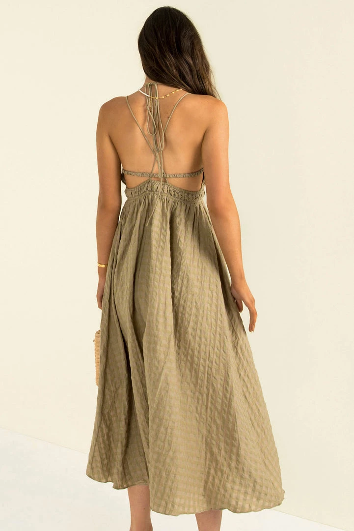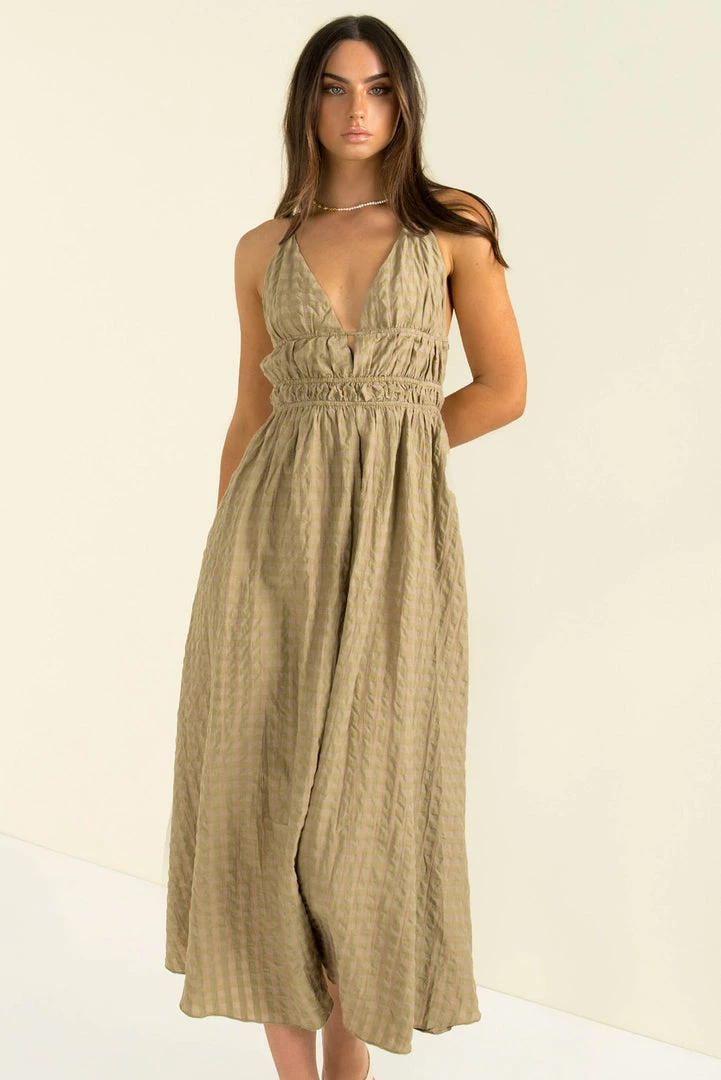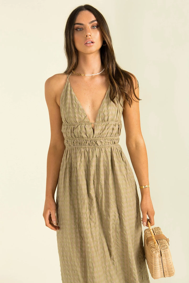 A stand-out maxi dress in Khaki! Our gorgeous Landon Dress is made from a high-quality fabric with a check texture throughout. She features a v-neckline with elastic details under the bust and at the waist. She also has a stunning open back with crossover straps, and an elastic strap at the waist. Finish your look with a crossbody bag and mules.