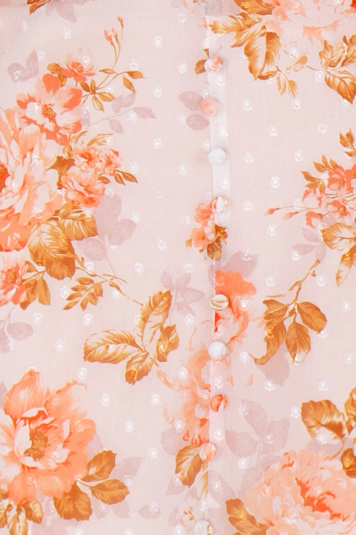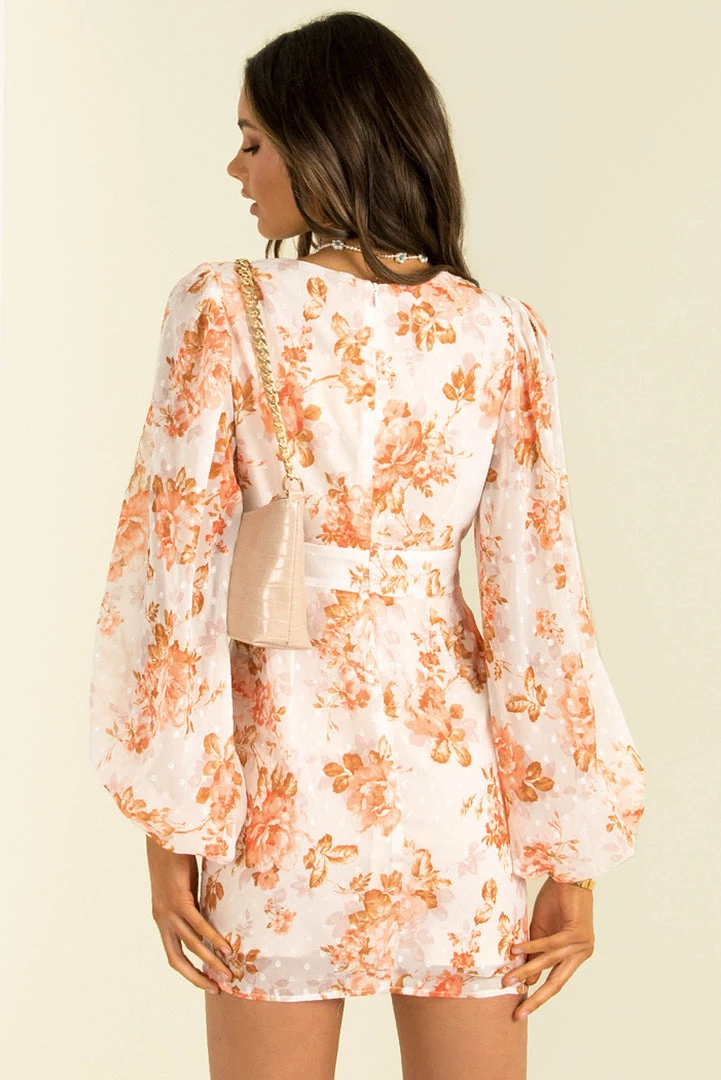 The most beautiful print! Our lovely Lilia Dress is a stunning mini made from a high quality fabric in a stunning peach floral print. She features a flattering V neckline, long sleeves and a button down front. Finish your look with gold hoops, a mini bag and strappy heels.
