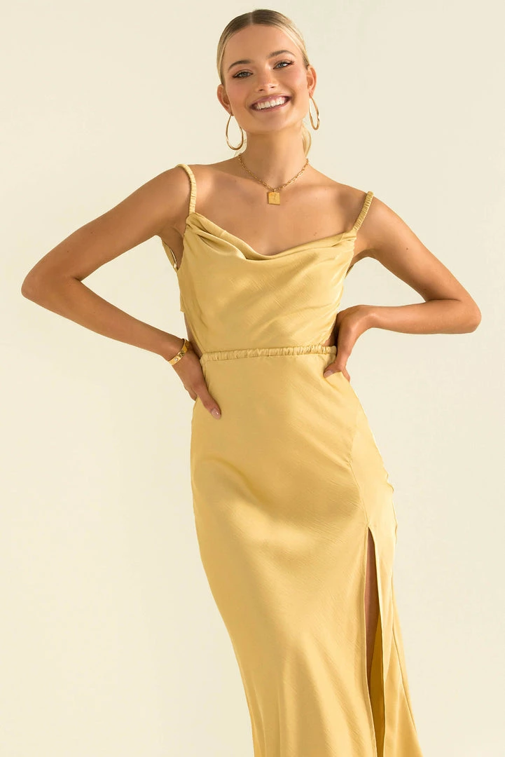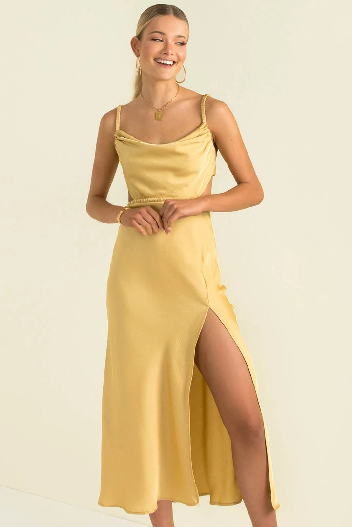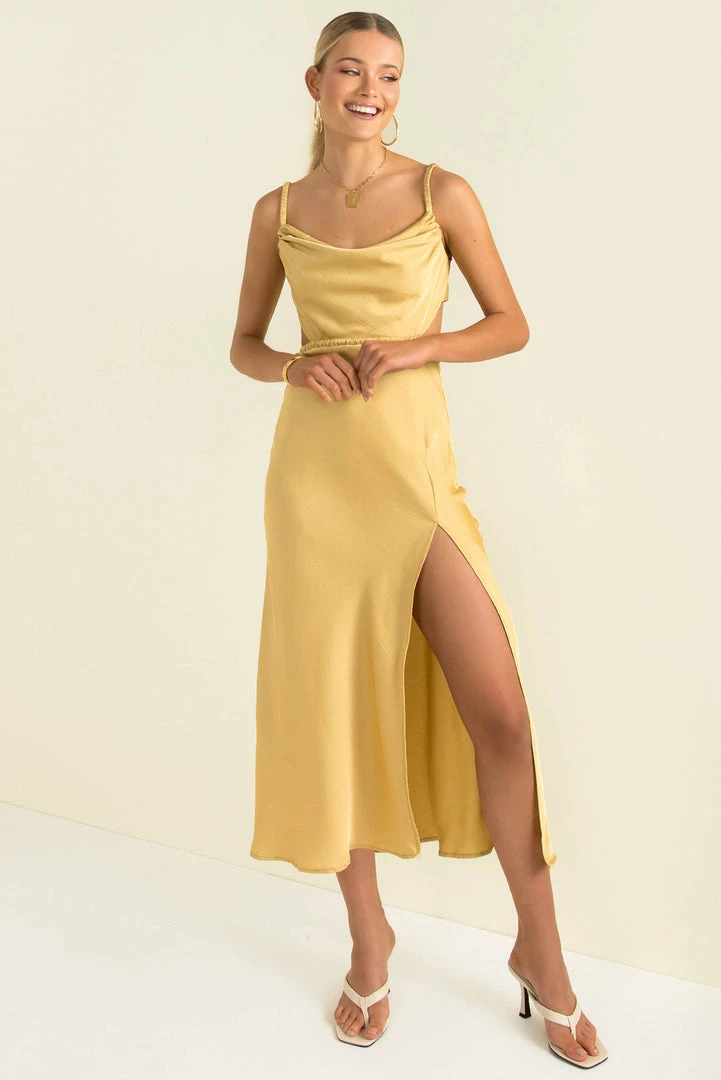 Fall head over heels for this stunning midi dress! Our beautiful Melody Dress is made from a shimmering fabric, that skims the body and falls like liquid. She features a cowl neckline, elastic shoulder straps and an elastic waist. She also has cutouts at the waist which lead to an open back with a gorgeous tie-up detail. Style her with strappy heels and a clutch for the perfect party look.Â