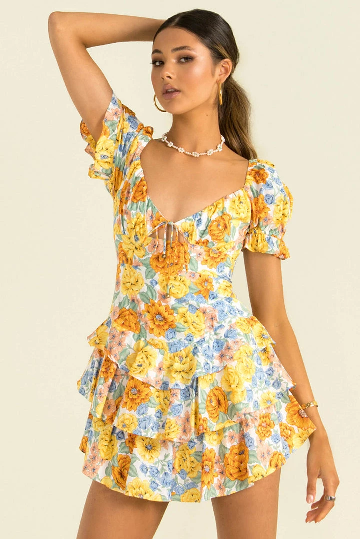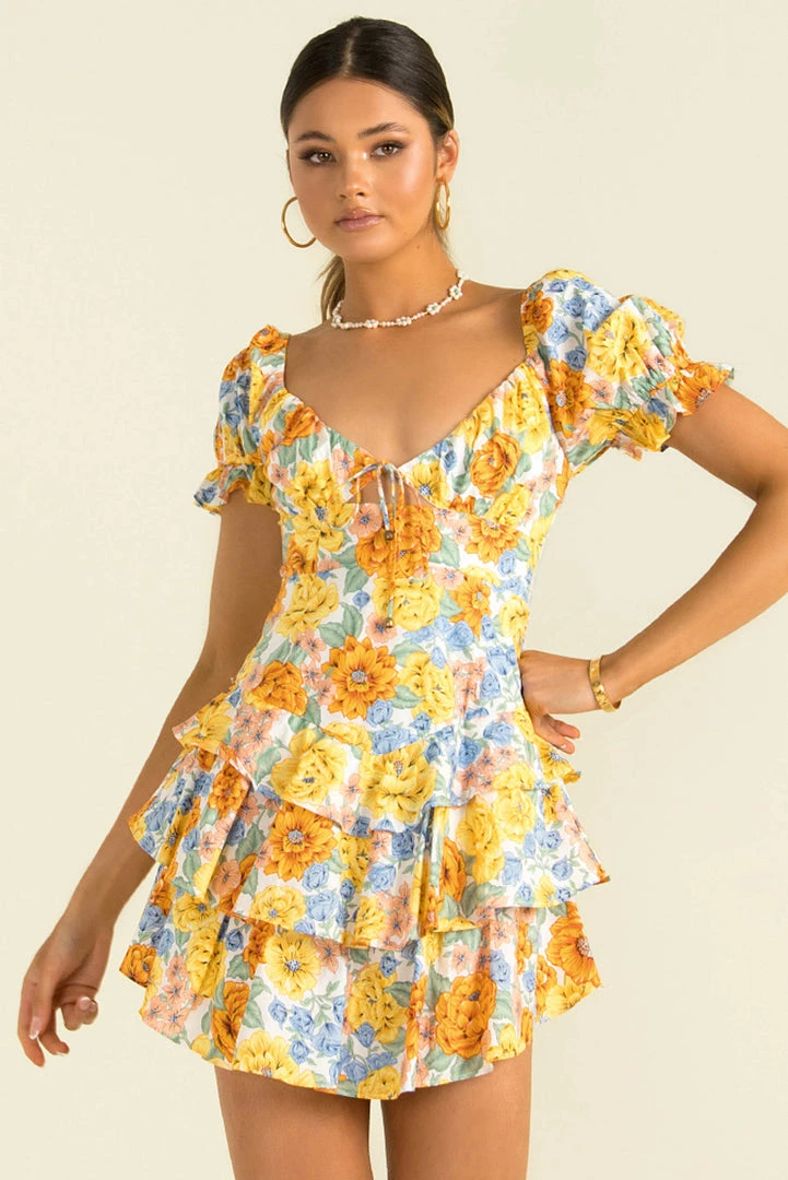 Fun and flirty! Our gorgeous Nancy Dress is made from a high-quality cotton fabric with a vibrant floral print throughout! She features a cupped bust with tie detail, puff sleeves and a tiered ruffle skirt. Style her with strappy heels and a mini bag for your next night out!
