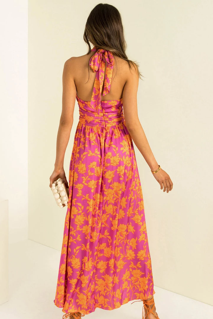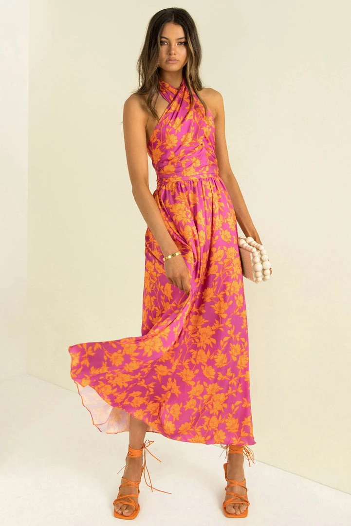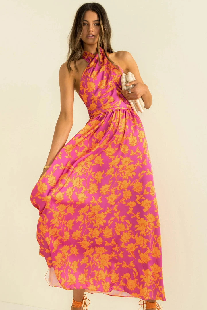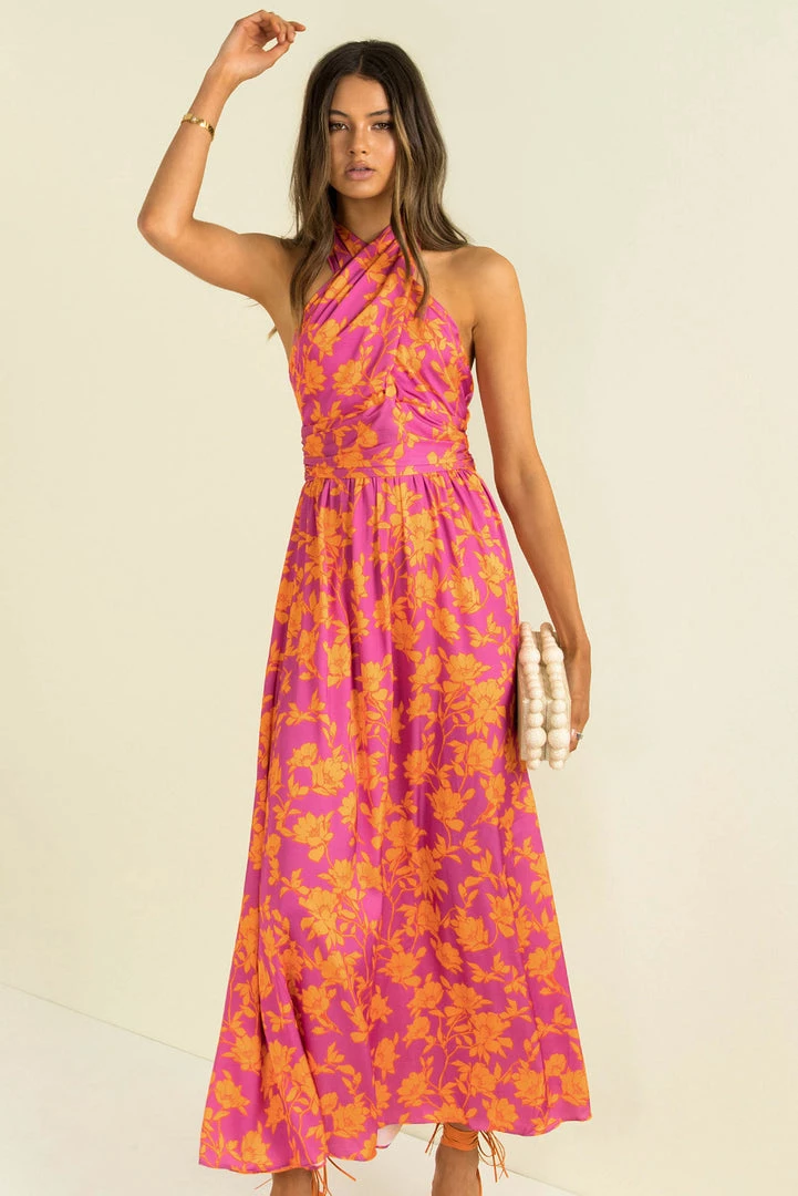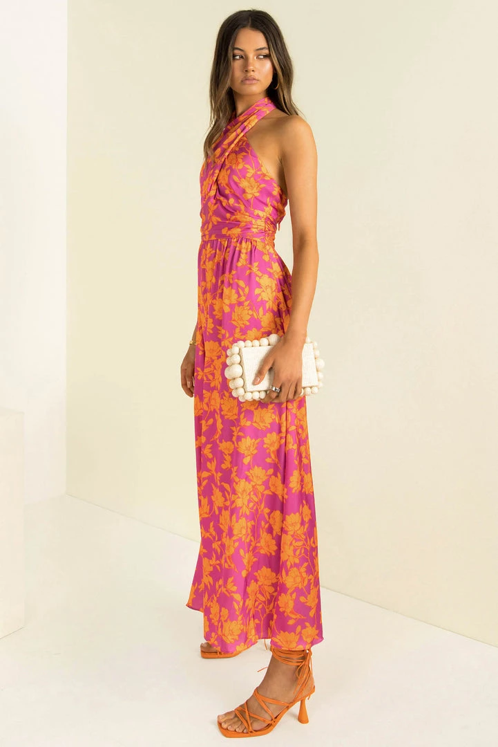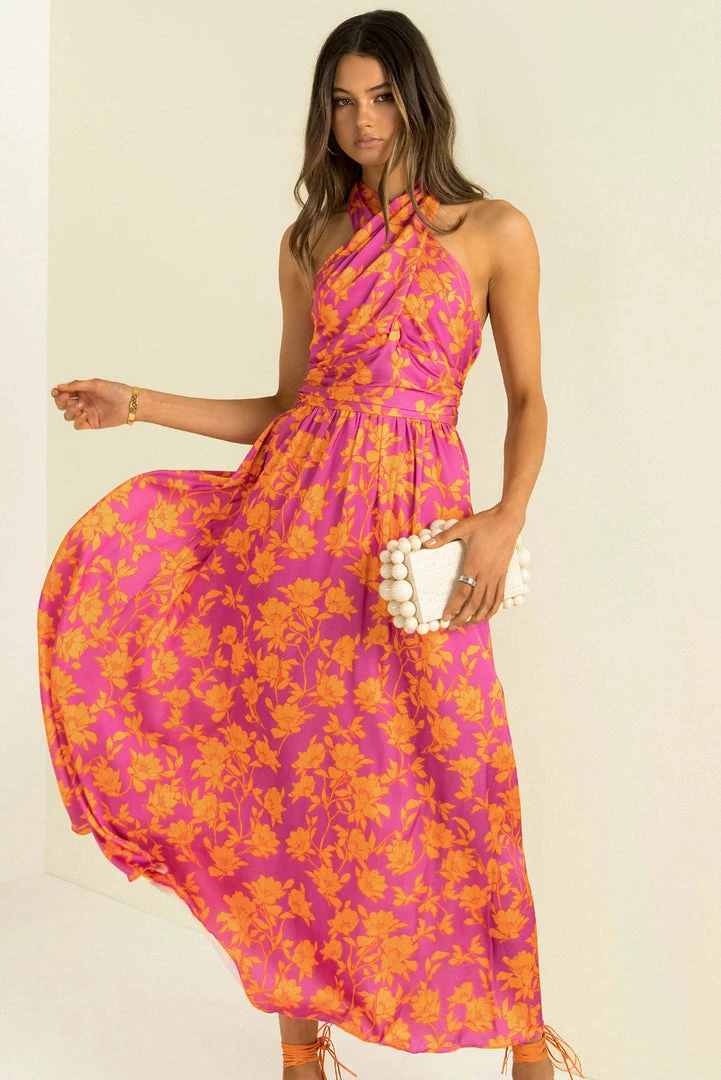 Perfect for your next event! Our stunning Rafael Dress is made from a high-quality satin fabric in a vibrant floral print. She features a crossover halter neckline, fitted bodice, flowing full-length skirt and an open back. Style her with strappy heels and a clutch for a look that will turn heads!
