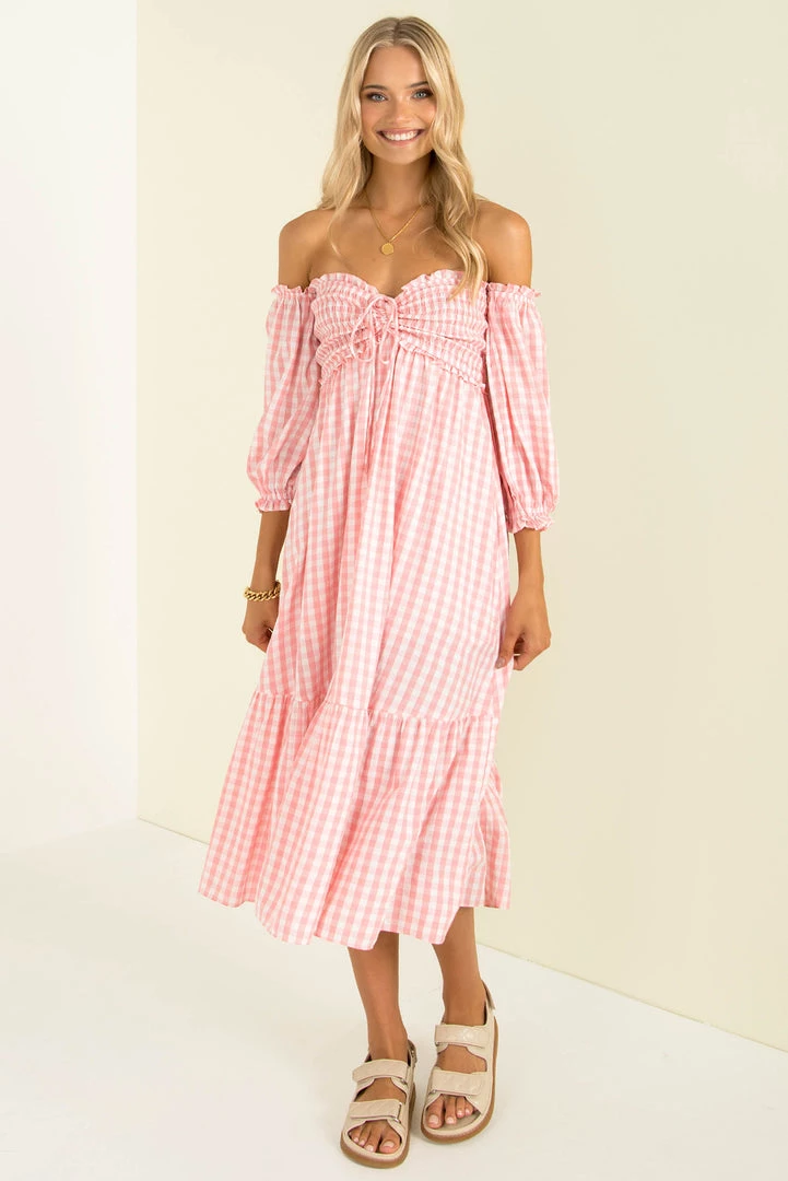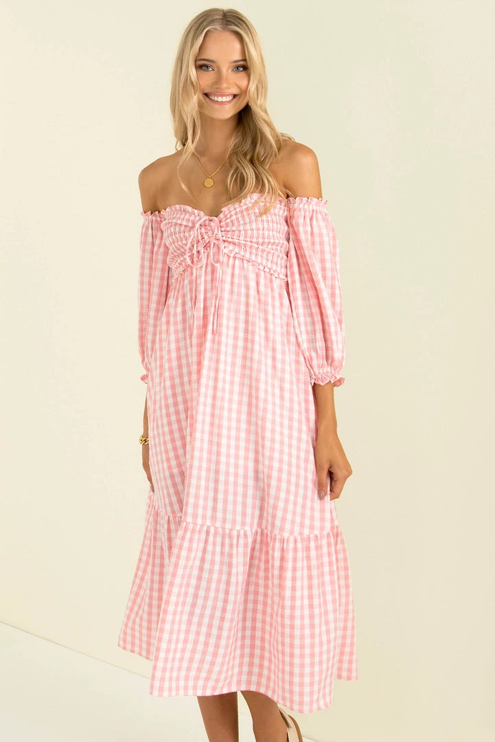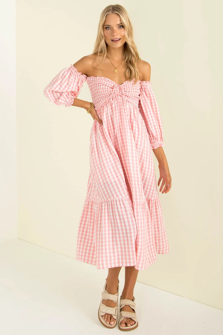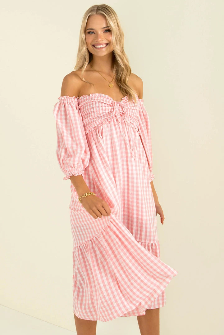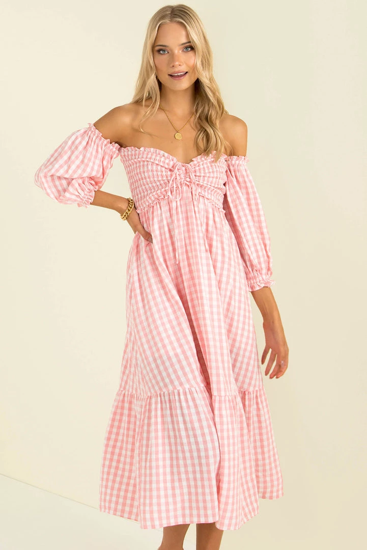 Summer vibes in our gorgeous Sierra Dress! Made from a lovely pink gingham fabric, this beautiful midi dress features a shirred bodice with tie detail, off-shoulder sleeves and a relaxed fit. Style her with mules and a mini bag for an easy breezy weekend look!