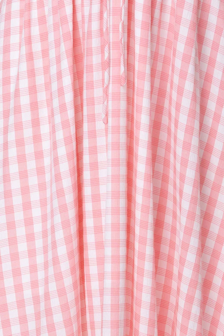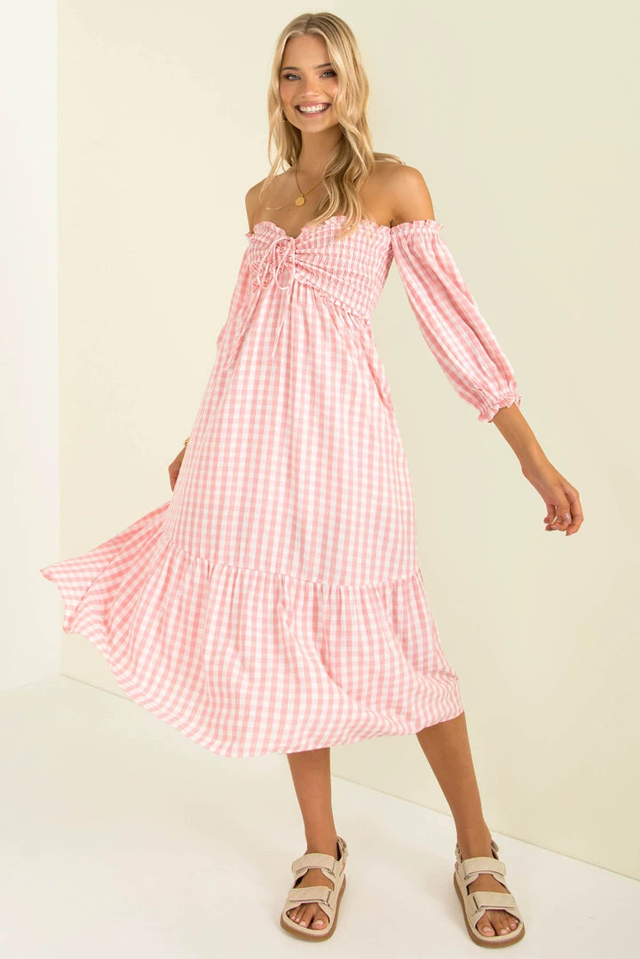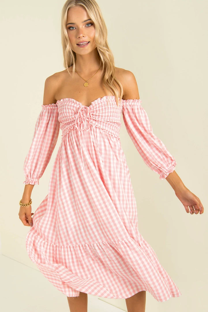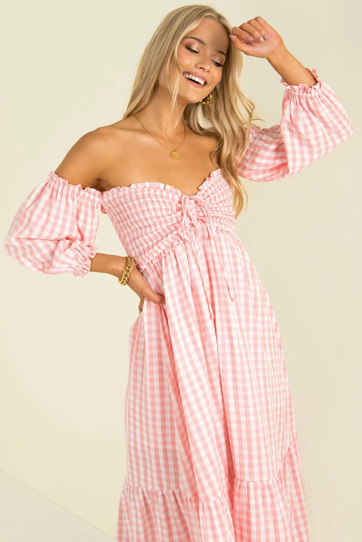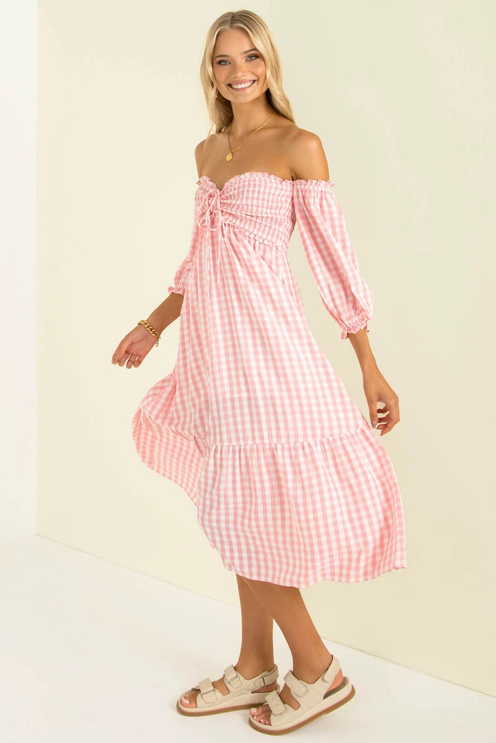 Summer vibes in our gorgeous Sierra Dress! Made from a lovely pink gingham fabric, this beautiful midi dress features a shirred bodice with tie detail, off-shoulder sleeves and a relaxed fit. Style her with mules and a mini bag for an easy breezy weekend look!