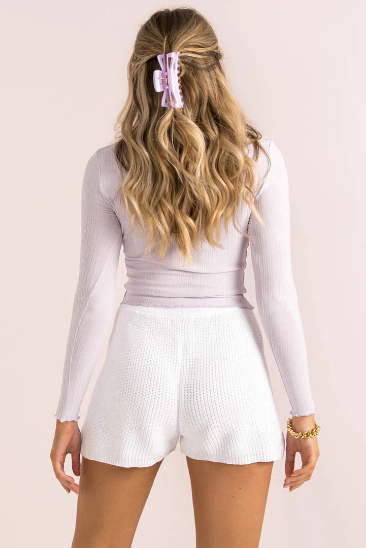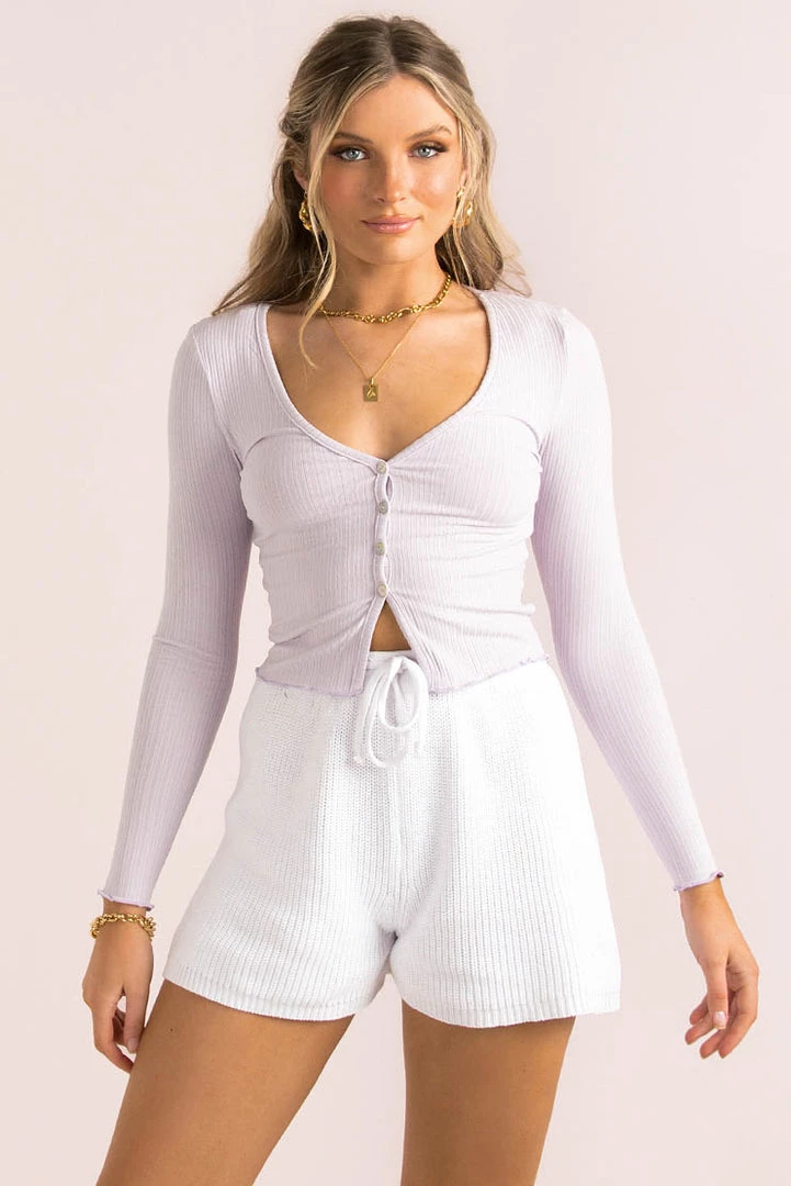 Melt hearts in our adorable Spencer Top! This cute top is made from a ribbed fabric in a gorgeous Lilac hue! It features a V-neckline, long sleeves and button closures in the front. We love it styled with high-waisted denim for a cute and comfy weekend look.