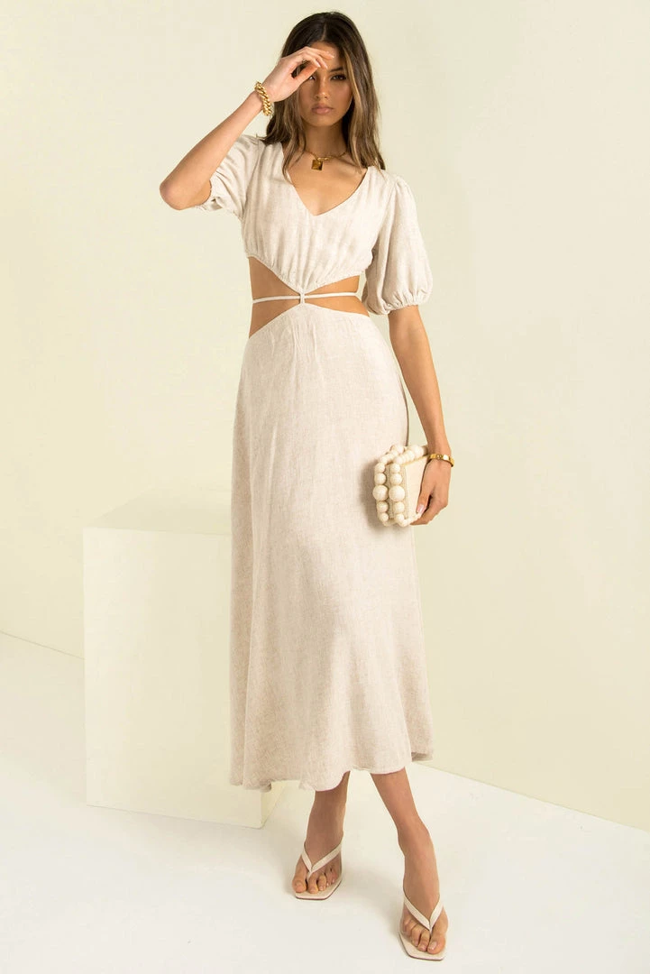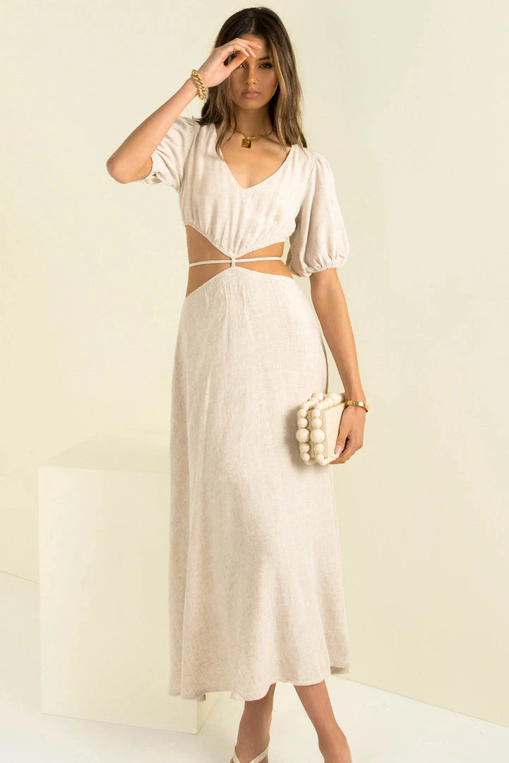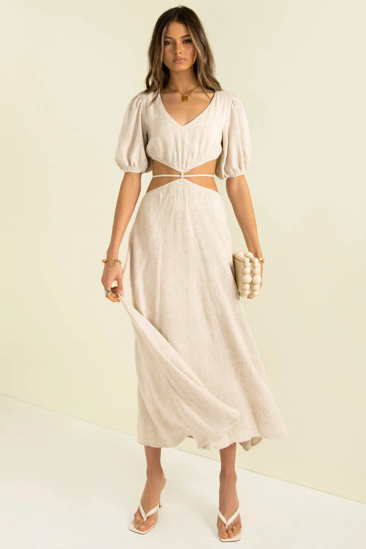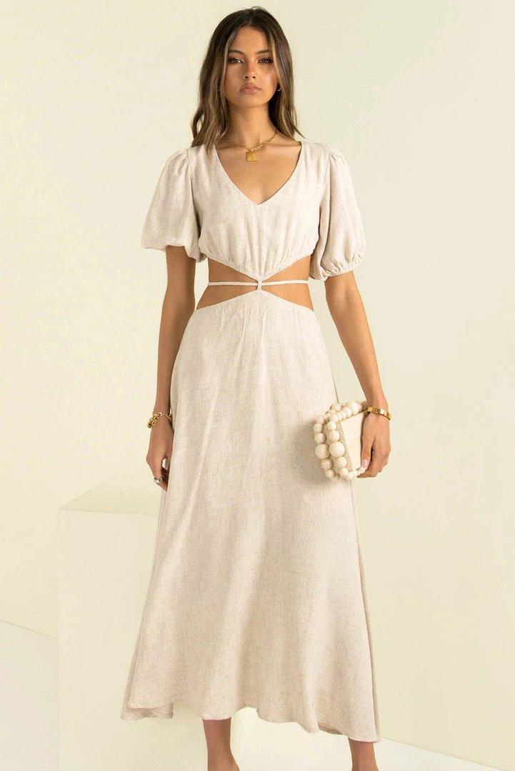A chic midi dress that can take you from day to night. Our Villa Dress is made from a high-quality fabric in a neutral hue. She features the most stunning details; puff sleeves, cutouts at the waist with waist-tie and a long flowing skirt. Style her with sandals for the day or dress her up with tan mules and a clutch.