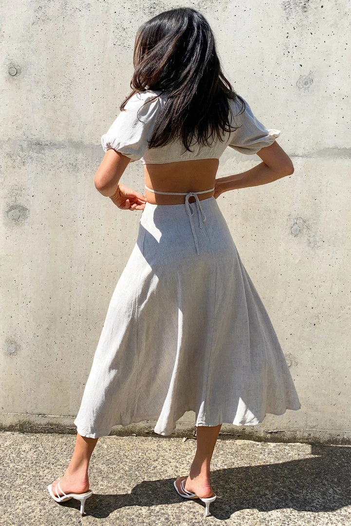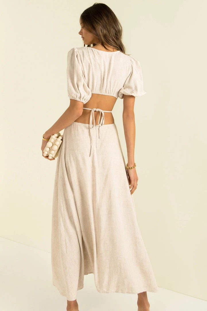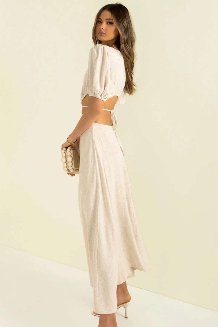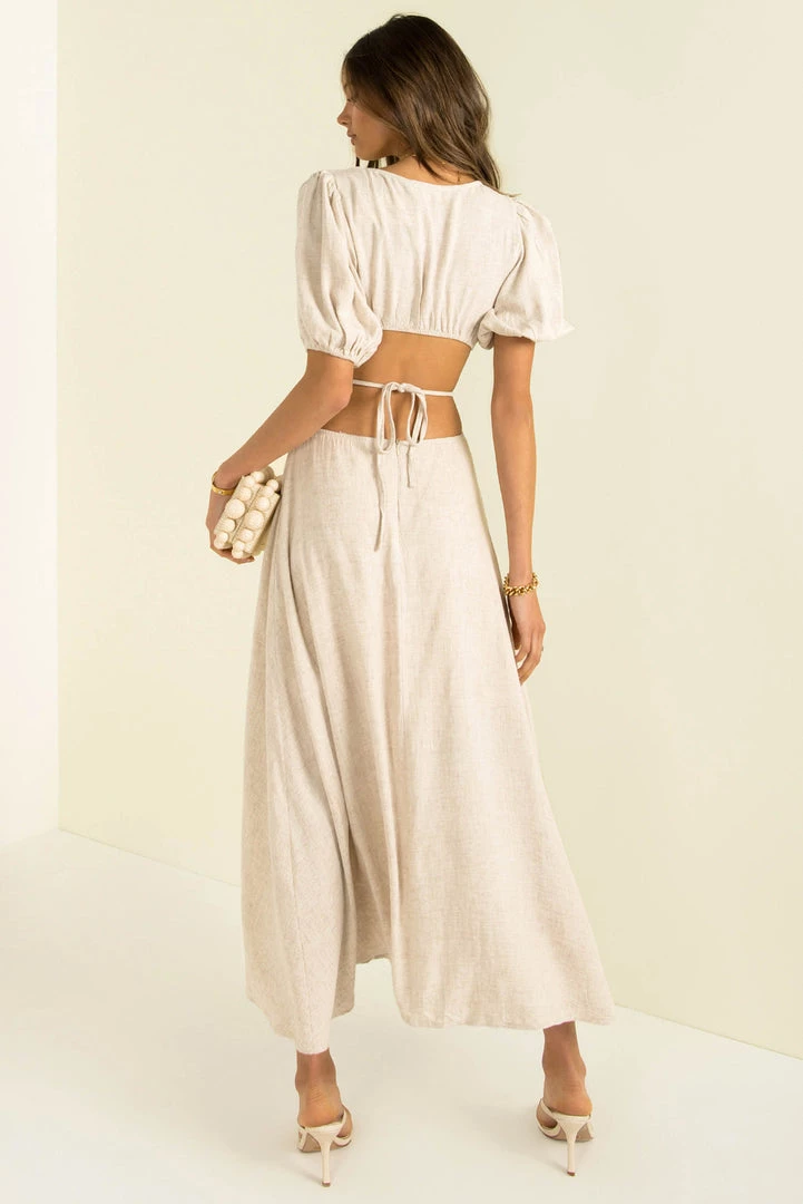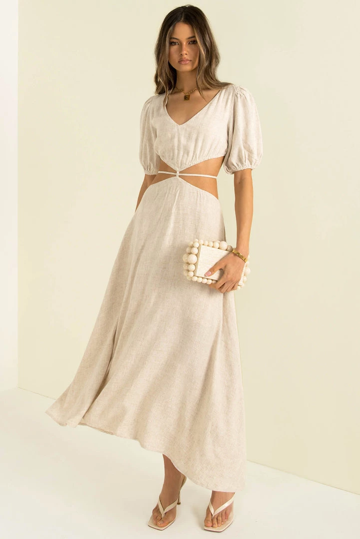 A chic midi dress that can take you from day to night. Our Villa Dress is made from a high-quality fabric in a neutral hue. She features the most stunning details; puff sleeves, cutouts at the waist with waist-tie and a long flowing skirt. Style her with sandals for the day or dress her up with tan mules and a clutch.