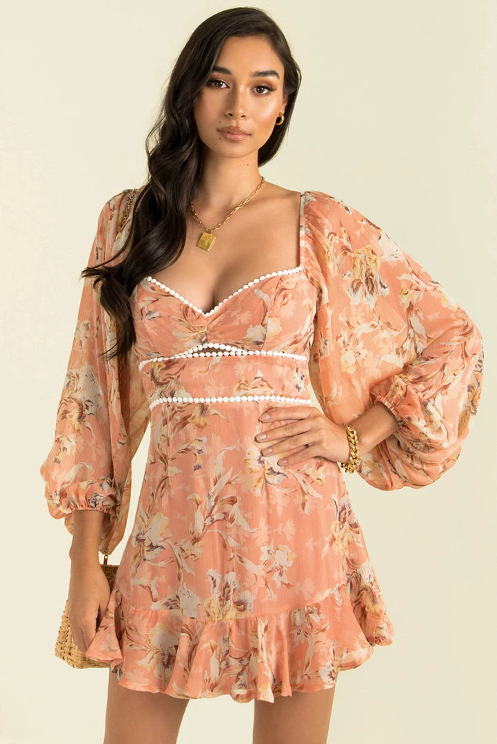 Such a dreamy floral dress! Our lovely Nicole Dress is made from a high-quality, textured fabric in a peach floral print. She features a cupped bust, a cutout in the front and a low back with tie-up feature. Style her with strappy heels and a mini bag for an effortlessly gorgeous look!