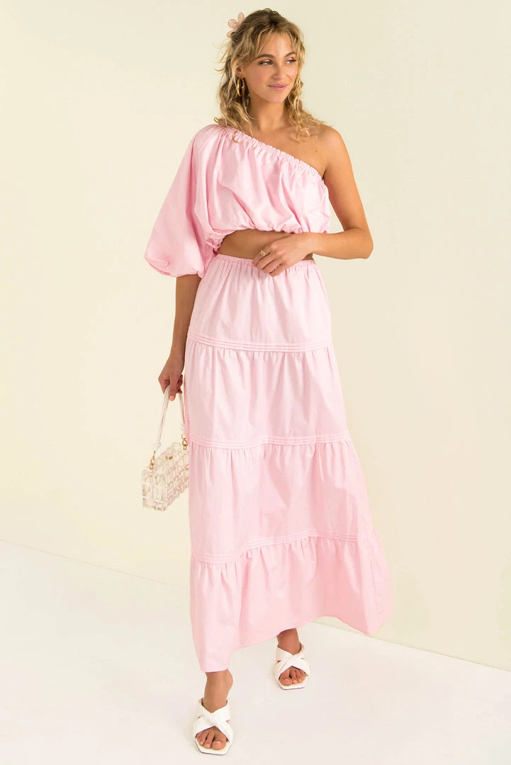 A stunning crop top with an Asymmetric neckline. Our gorgeous Nixie Top is made from a high-quality cotton fabric in a soft pink. She features one puff sleeve, gathered detailing and an elastic hem for a comfy fit. Style her with our matching Matilda Skirt and mules for an easy breezy weekend look.