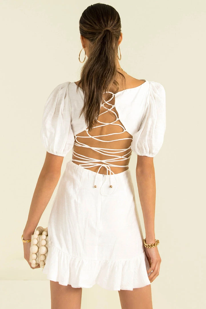 Romance is born in our lovely Nova Dress. This gorgeous mini dress is made from a high-quality fabric in a fresh white. She features a fitted bodice with draped detailing, puff sleeves and a drawstring detail through the skirt. She also has the most stunning open back with lace-up detailing. Finish your look with gold jewellery and strappy heels!