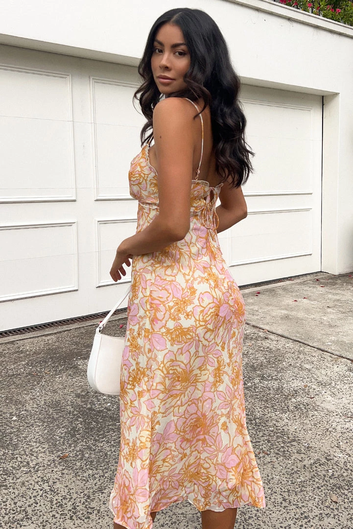 A chic midi dress in a gorgeous print! Our Pia Dress is made from a textures chiffon fabric with a a floral print throughout. She’s a mid-length slip dress with cute ruffle details, thin adjustable straps and a tie-up detail in the back. Styler her mules and a mini bag for a stunning weekend look!