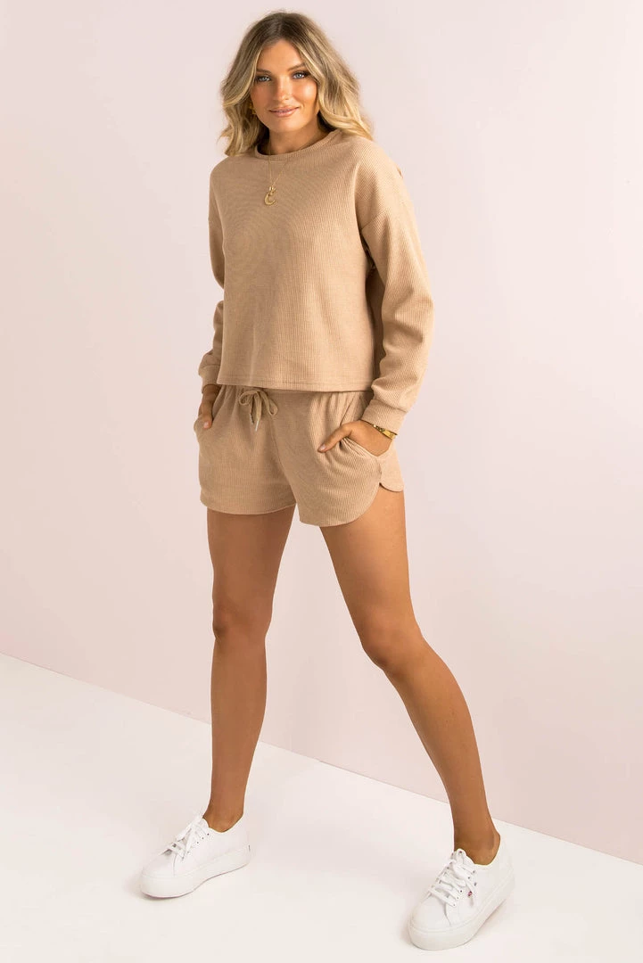 Feel cute and comfortable in our gorgeous Pippa Shorts! These cute shorts are made from a beige waffle texture fabric and are an easy fit, with an elasticated waist and drawstring tie. We love them styled with out matching Pippa Top, a mini back and white sneakers for the perfect off-duty look!