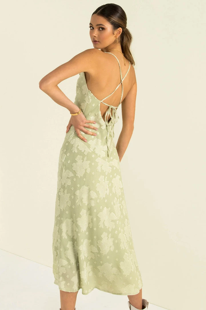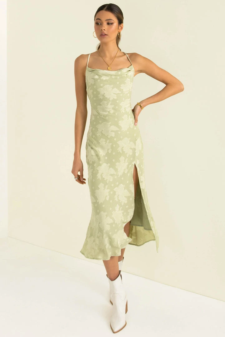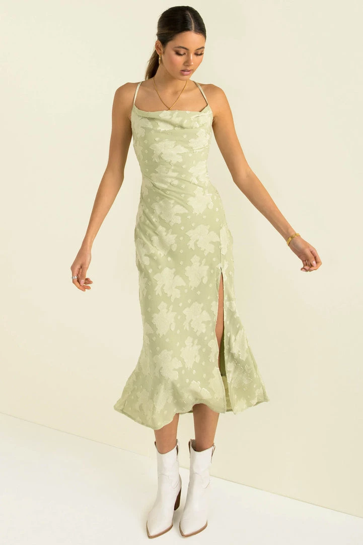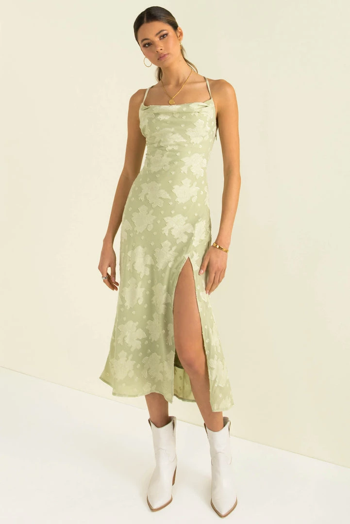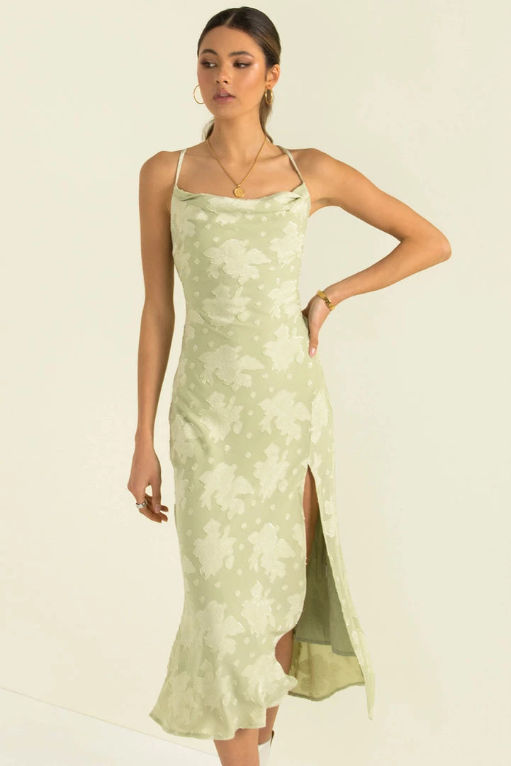 Turn heads in our stunning Portia Dress! This gorgeous midi dress is made from an high-quality fabric in a soft green with a floral design throughout. She features a slight cowl neckline, a split in the front and thin adjustable straps and a crossover lace-up back. Style her with nude heels and gold hoops for your next night out!