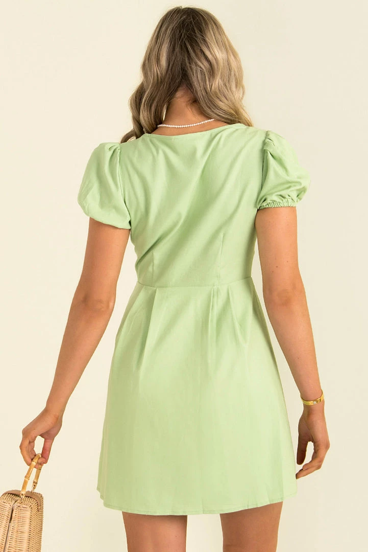 Total Summer vibes in our gorgeous Regan Dress! She’s made from a cotton fabric lime  and features a V neckline, puff sleeves and cute buttons down the front. We love her styled with mules and a woven bag for the perfect weekend look!