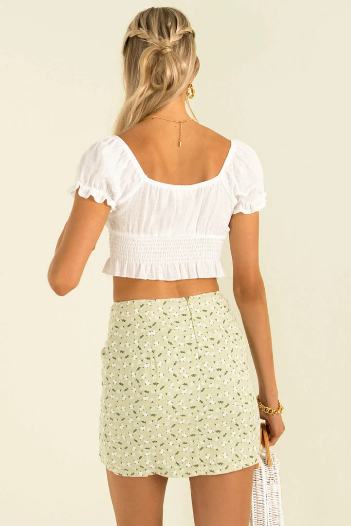 The perfect mini skirt that your wardrobe will love! Made from sage floral print fabric, this baby sits high-waisted and is the most flattering fit! We love her styled with a white crop and sandals for total Summer vibes!
