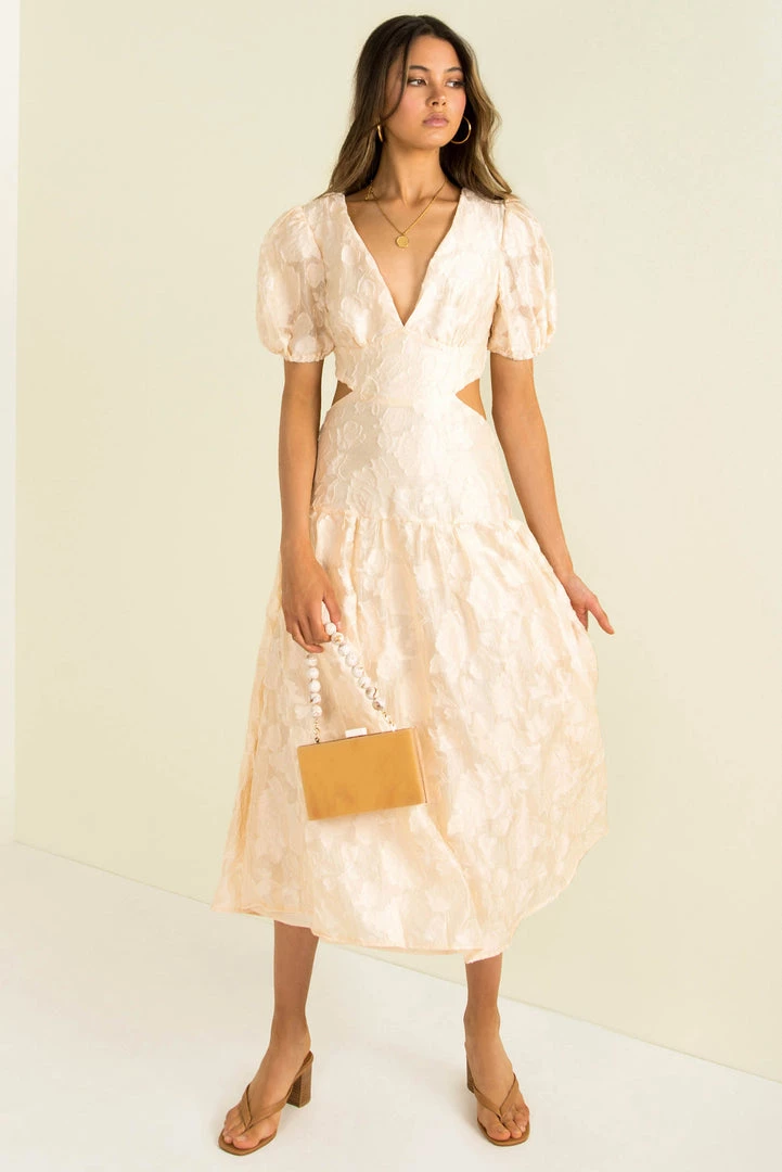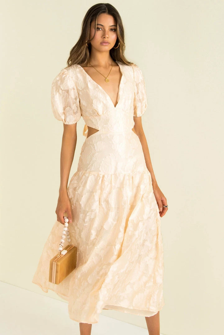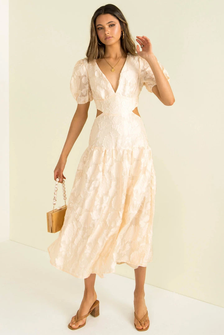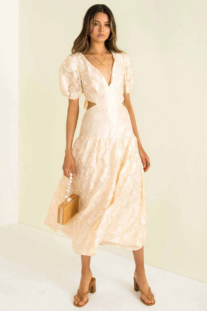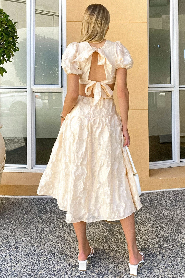 Feel effortlessly beautiful in our lovely Rhianne Dress! She’s made from a high-quality fabric in cream with a floral design throughout. She features a v-neckline, puff sleeves, a fitted bodice and a full length skirt. She also has a stunning open back with double tie-up details. Style her with strappy heels and a mini bag for your next event.