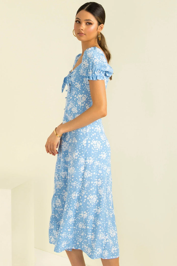 Feel effortlessly gorgeous in our gorgeous Rosalee Dress! Made from a gorgeous blue floral print fabric, this must-have midi dress is features a tie-up bust with short puff sleeves and a mid-length skirt. Wear her with sneakers and a crossbody bag for a feminine but cool weekend look!