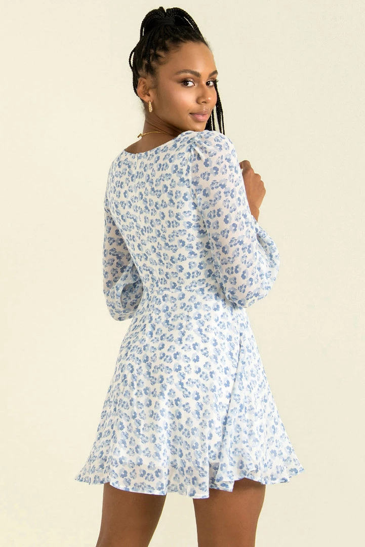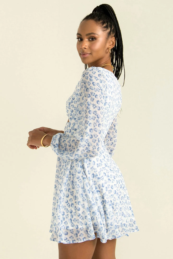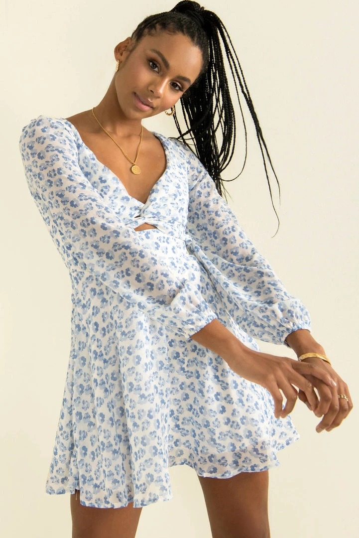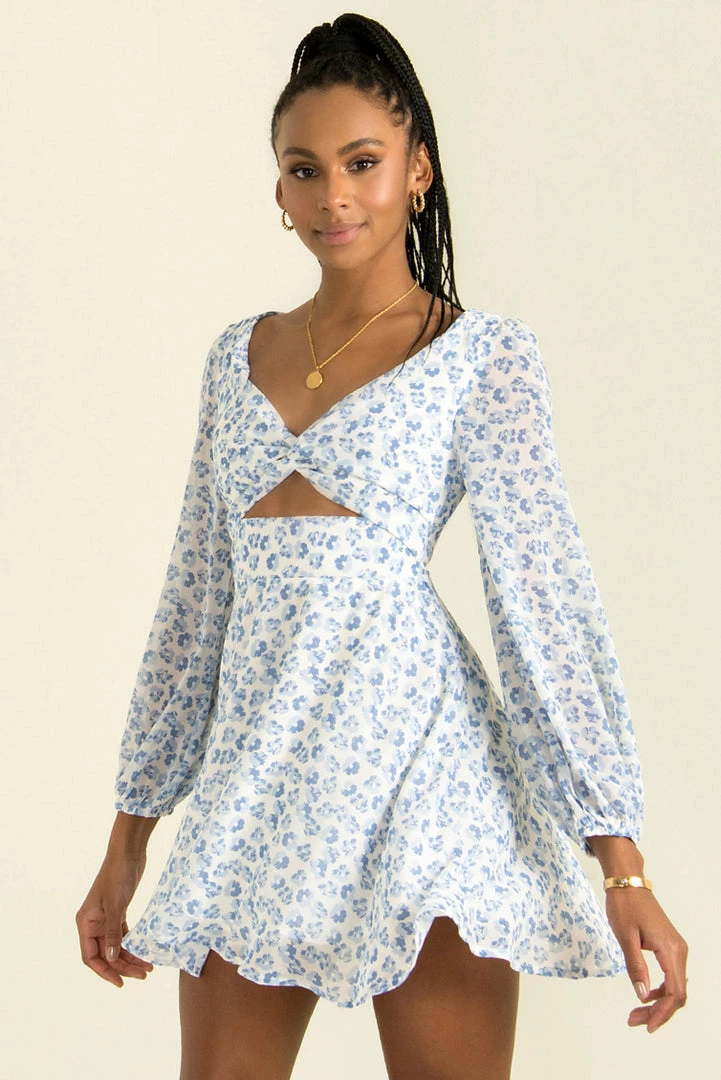 A gorgeous floral dress with all the details we love! Our beautiful Rosalyn Dress is made from a blue floral print fabric and features a twist detail at the bust with cutout underneath, long sleeves and a floaty skirt. Style her with tan mules and a clutch for a stunning look!