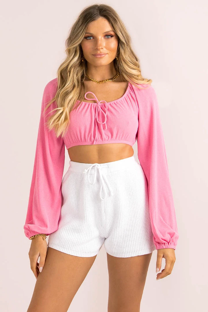 Feel effortlessly gorgeous in our Salma Top! This cute crop top is made from a  vibrant pink fabric and features an elastic neckline with drawstring tie the front and long sleeves. We love her styled with high-waisted denim and mules for a dreamy weekend look!Â