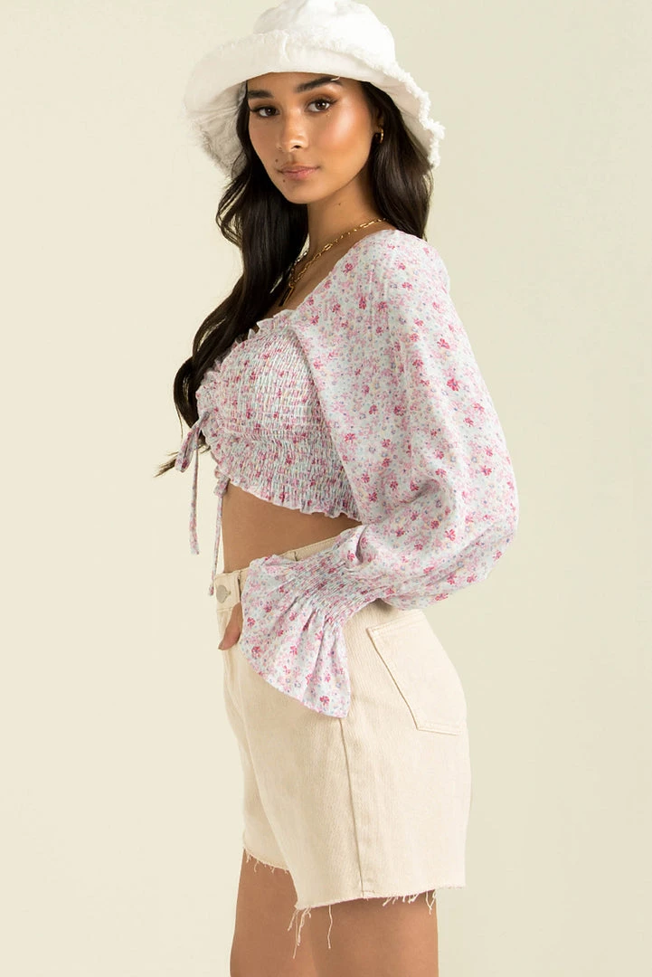 Say hello to the cutest ruched top your wardrobe needs! Made from a gorgeous lilac and blue floral print fabric, it features a shirred bodice, drawstring detail in the the front and long sleeves with elastic cuffs. We love it paired with denim and woven mules!