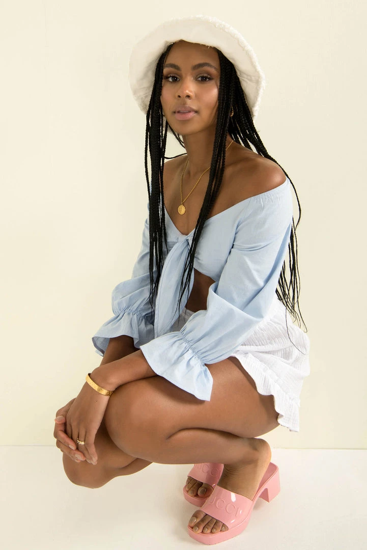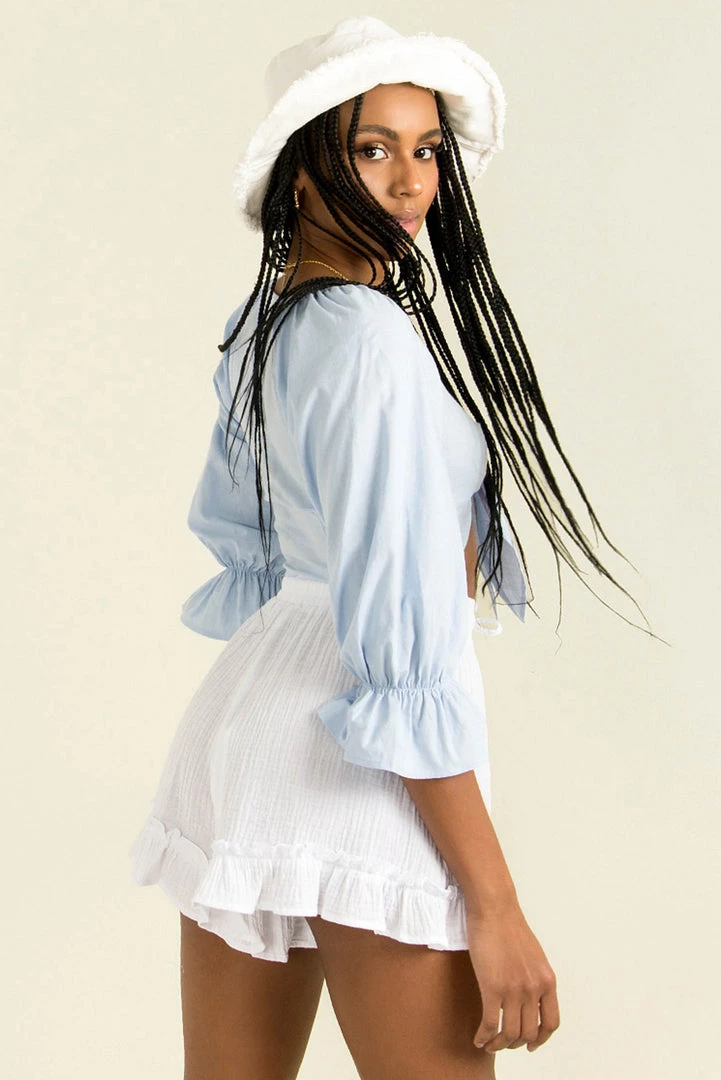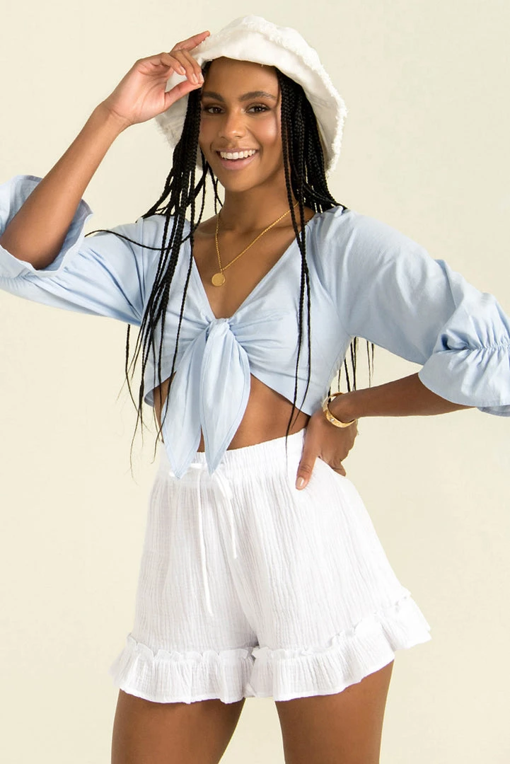 Feel adorable in our cute Sana Top! Made from a light blue fabric, she features mid-length sleeves, flared cuffs and a tie-up front. We love her styled with high waisted shorts and a chunky sandals for a fresh weekend look!