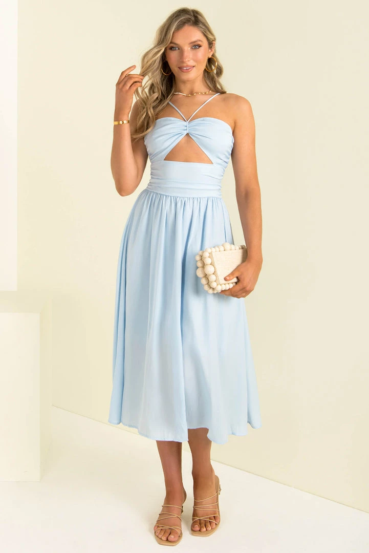 Designed to flatter, our Sheree Dress is perfect for your next event! This stunning midi dress is made from a light blue fabric and features a cutout in the front, fitted waist and a full mid-length skirt. Finish your look with strappy heels and gold accessories.
