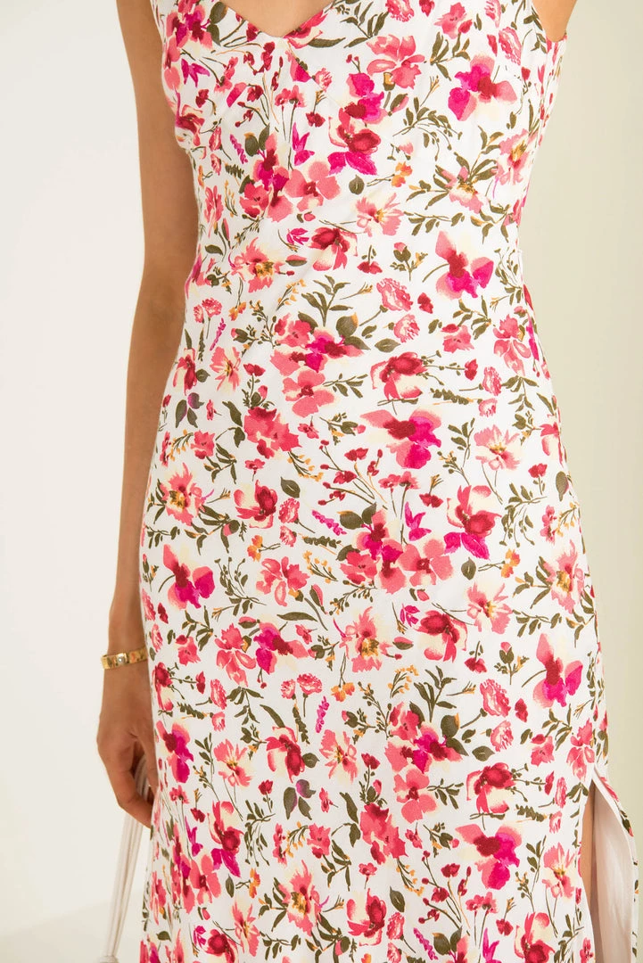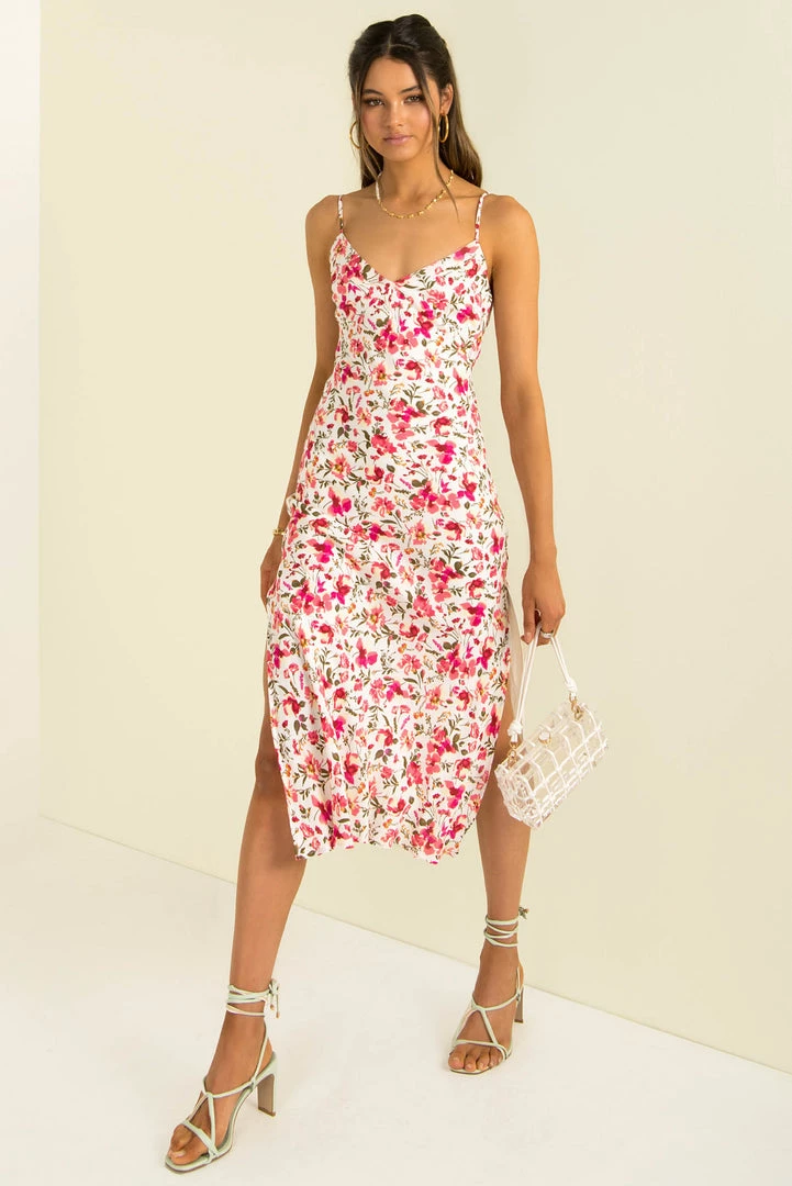 European Summer vibes in our stunning Sofia Dress! This gorgeous midi dress is made from a white and pink floral print fabric and features a sassy leg split and an open back with tie-up detail. Style her with sneakers for the day or dress her up with mules and gold hoops for a look that will turn heads!