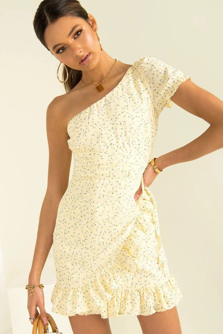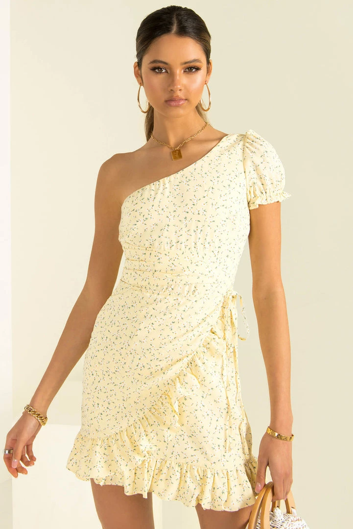 This floral beauty is a total must-have! Our adorable Stella Dress is made from a lemon coloured fabric with a dainty floral print throughout. She has all the details we love; an a symmetric neckline with on sleeve, a wrap style front that ties at the waist and cute frill details. Dress her up with heels or keep her casual with tan slides and a crossbody bag.Â