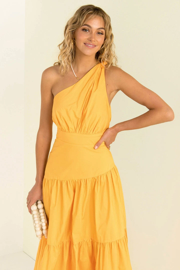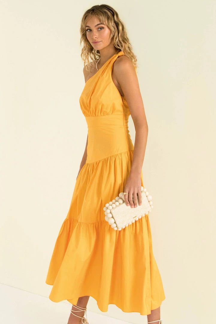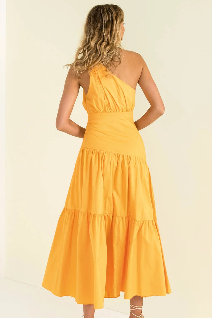 Our beautiful Sutton Dress is perfect for your next event! This lovely midi dress is made from a high-quality cotton fabric in a gorgeous orange hue! She has an asymmetric neckline with one shoulder strap, a fitted bodice and a full-length skirt. Finish your look with mules and a mini bag!
