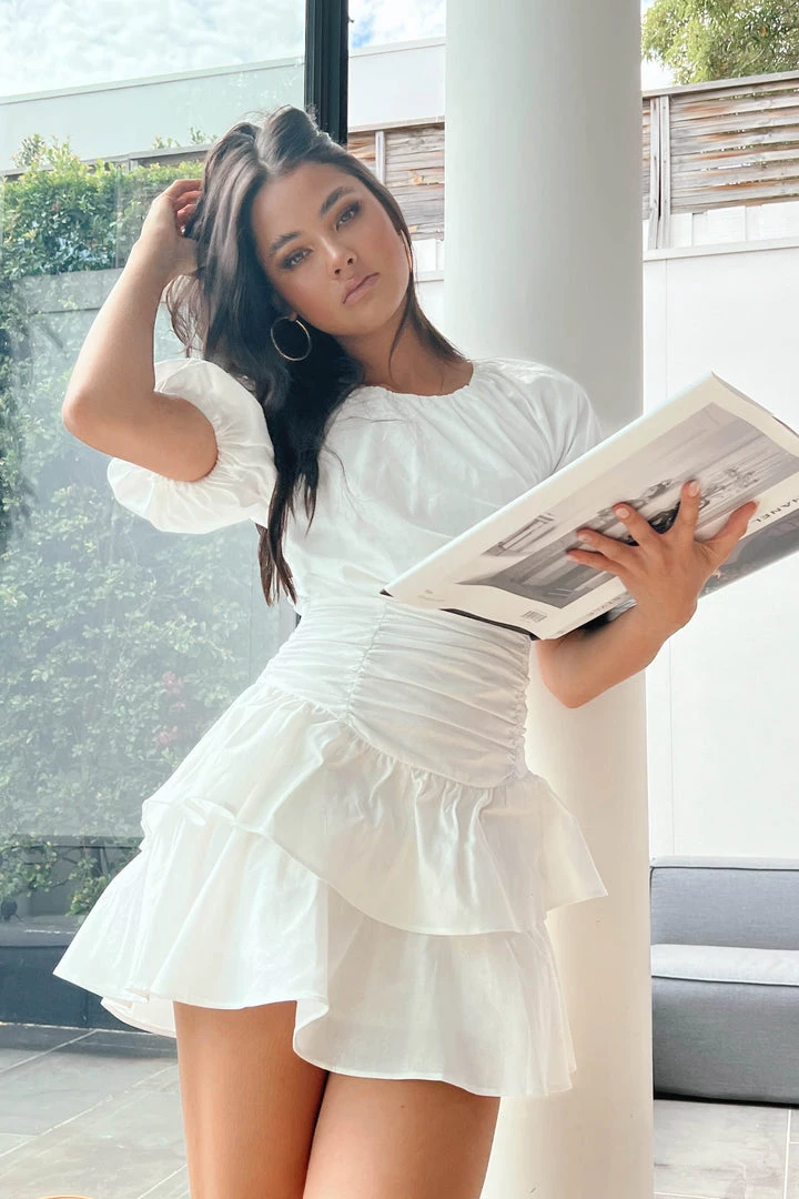 The most beautiful mini dress with stunning details. Our must-have Talina dress is made form a high-quality, linen fabric in white. She features a round neckline, puff sleeves, ruched detailing at the waist and a tired ruffle skirt. She also has a cutout detail in the back that’s finished with a tie closure at the back of the neck. Style her with gold jewellery, a clutch and strappy heels.